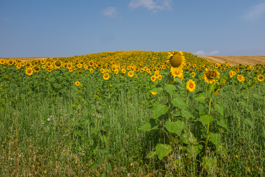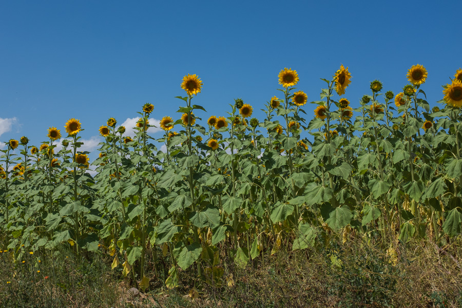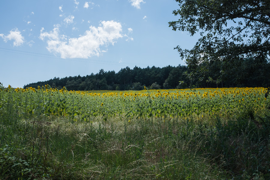 Dann treffe ich zum wiederholten Male zwei junge Männer. Dieses Mal spreche ich sie an, sie kommen aus China und freuen sich tierisch über die vielen Sonnenblumenfelder.