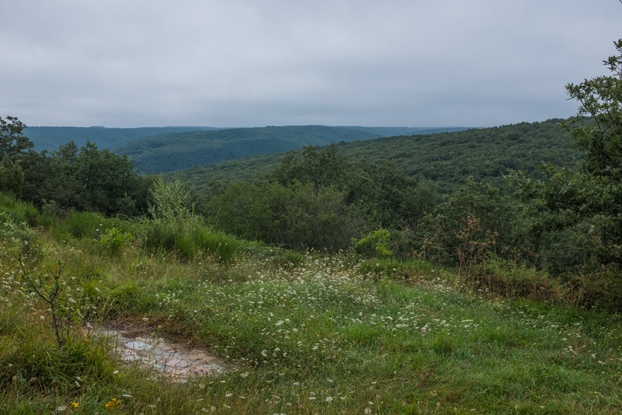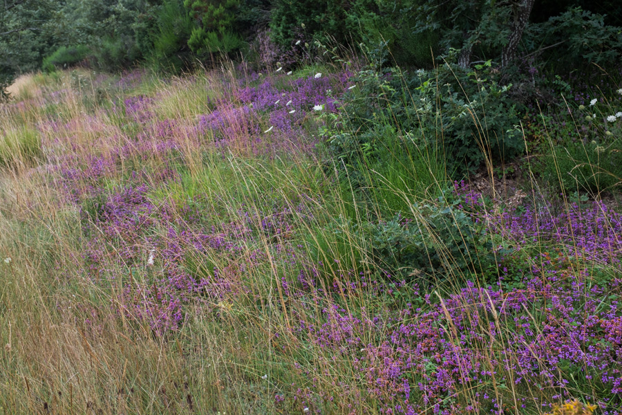 Am Wegesrand blüht die Heide, es sieht wunderschön aus. Die Sicht ist nach wie vor nicht gut, die Temperatur ist aber sehr angenehm, endlich mal nicht schwitzen. Wobei ich natürlich aus der Puste komme, denn den Weg kann man nicht gerade als eben beschreiben.
