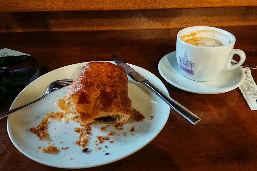 Iche gehe ich das gegenüber liegenden Hostal und frage nach einem Kaffee und Croissant. In der Bar bekam ich dann beides. Kein gesunder Start, aber besser als nichts.