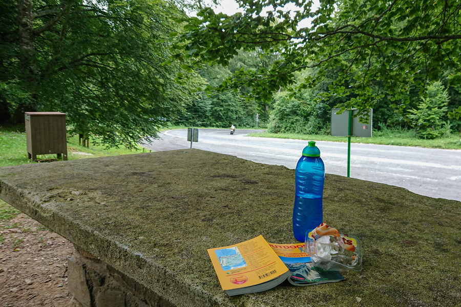 Da ich wie schon geschrieben weder in Burguete (nach 2,6 km) noch in Espinal (nach 7 km) einen Stop einlegte, musste ich dann mit Wasser und einem Donut, welchen ich mir am Morgen vorsichtshalber in der Bar gekauft habe, vorlieb nehmen. . Da bin ich dann schon fast 9 km gelaufen. Ich möchte keine Blasen bekommen und daher ziehe ich mir immer wieder Schuhe und Strümpfe aus und lasse Luft an die Füße. Bisher habe ich auch Glück gehabt.