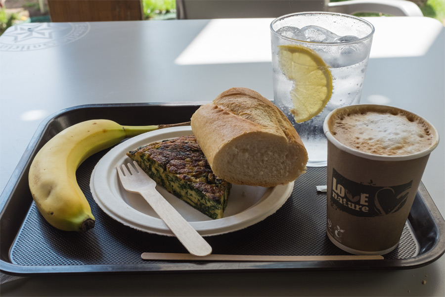 Nach knapp 10 Kilometern erreiche ich Zuriain und endlich kann ich die ersehnte Pause machen. Ich kaufe mir eine Spinatquiche, ein Tonicwasse, einen Cappuccino und eine Banane. Wer weiß, wann ich das nächste Mal etwas bekommen.