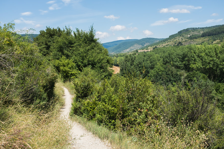 • Auch wenn ich nun den Pass überquert habe, heißt es noch lange nicht, dass es nun stetig und geruhsam bergab geht. Als ich die nächste Abzweigung sah, brauchte ich erst einmal eine Pause, denn es ging 50 m steil hinunter, auf Geröll. Während ich also da saß und überlegte, kam ein junger Mann und fragte nach dem Weg. Wir unterhielten uns auf englisch, als er plötzlich meinte, wollen wir nicht lieber auf deutsch reden? Ha, ha... aber seine Begleitung kam aus Slowenien und sprach nur englisch. Er erzählte, dass seine Vorfahren aus Santiago kommen und er beginnt ein ERASMUS-Studium dort. Daher hat er sich überlegt auf dem Pilgerweg dorthin zu gehen.