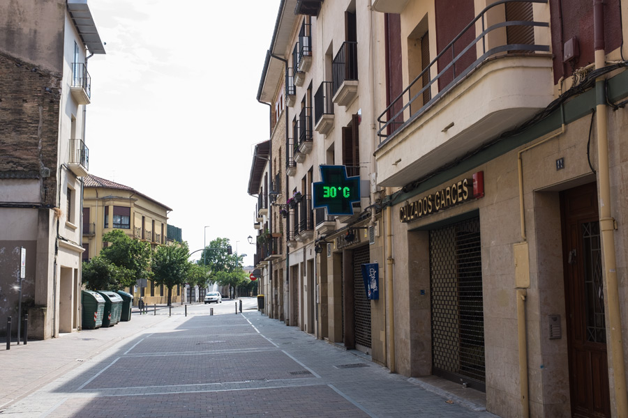 Jedenfalls laufe ich wieder zurück und überquere die Brücke und ja, nun bin ich richtig. Villava zählt schon zu einem Vorort von Pamplona. Das beschwingt und ich laufe nun sehr lange immer geradeaus. Unterwegs sehe ich Temperaturanzeigen, 30/32/34 alles ist vorhanden. Es scheint so, dass es heiß ist.