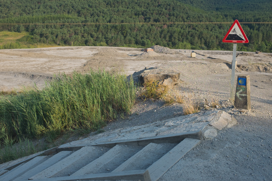 • Auch wenn ich nun den Pass überquert habe, heißt es noch lange nicht, dass es nun stetig und geruhsam bergab geht. Als ich die nächste Abzweigung sah, brauchte ich erst einmal eine Pause, denn es ging 50 m steil hinunter, auf Geröll. Während ich also da saß und überlegte, kam ein junger Mann und fragte nach dem Weg. Wir unterhielten uns auf englisch, als er plötzlich meinte, wollen wir nicht lieber auf deutsch reden? Ha, ha... aber seine Begleitung kam aus Slowenien und sprach nur englisch. Er erzählte, dass seine Vorfahren aus Santiago kommen und er beginnt ein ERASMUS-Studium dort. Daher hat er sich überlegt auf dem Pilgerweg dorthin zu gehen.