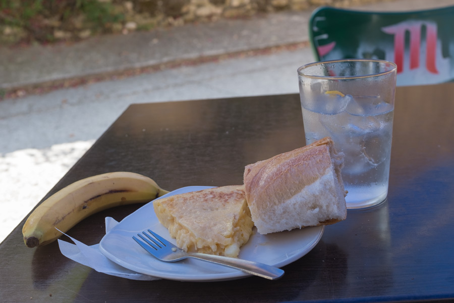 Nun bin ich 11 km gelaufen und wieder lange hinauf auf Schotterpisten, nun brauche ich unbedingt eine Pause. Diese mache ich in dem Dorf Zariquiegui. Es gibt - wie so immer eine vegetarische Tortilla, eine Banane und ein Tonic Wasser.