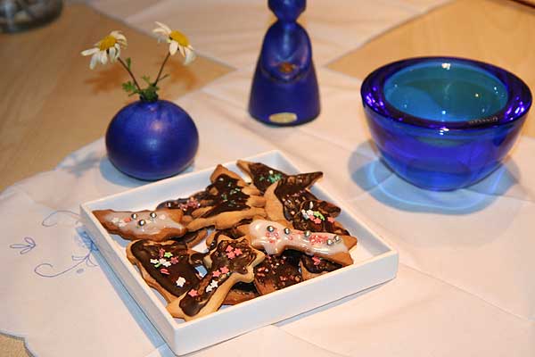 Heute ist ganz furchtbares Wetter, so haben wir unsere Backsachen herausgeholt und gebacken... Das hat riesigen Spaß gemacht und wir haben uns natürlich nicht immer an die Rezeptvorlagen gehalten, denn wir hatten so viele schöne Sachen zum Verzieren ![]()
