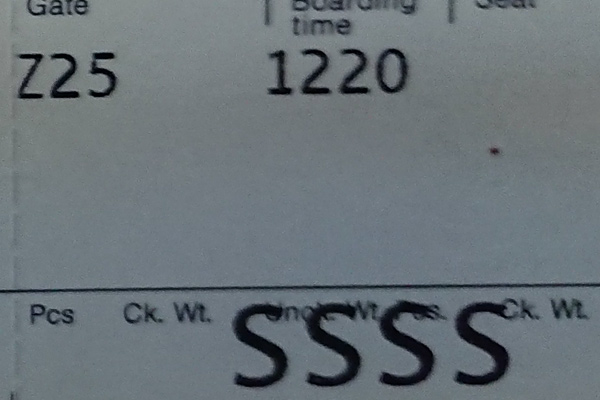 SSSS bedeutet man wurde ausgewählt für einen zweiten intensiven Security-Check, der dann auch schon mal sehr intensiv ausfallen kann. Ich hatte Glück, es war mehr ein Small-Talk und natürlich wurde ein Sprengstofftest gemacht, aber das habe ich fast auf jedem Flug, wenn ich mit großer Fotoausrüstung irgendwohin fliege.