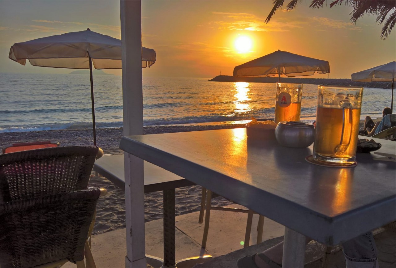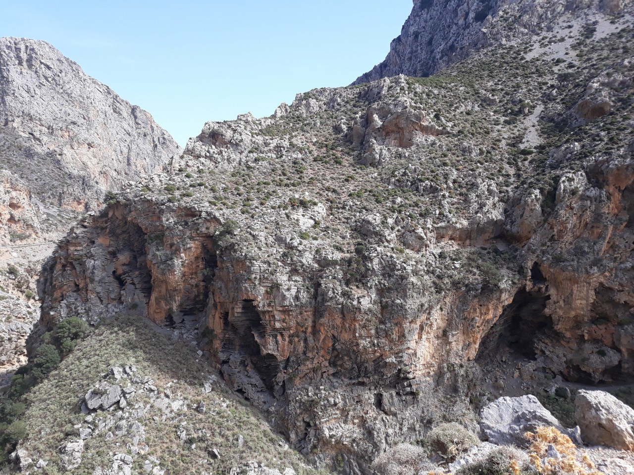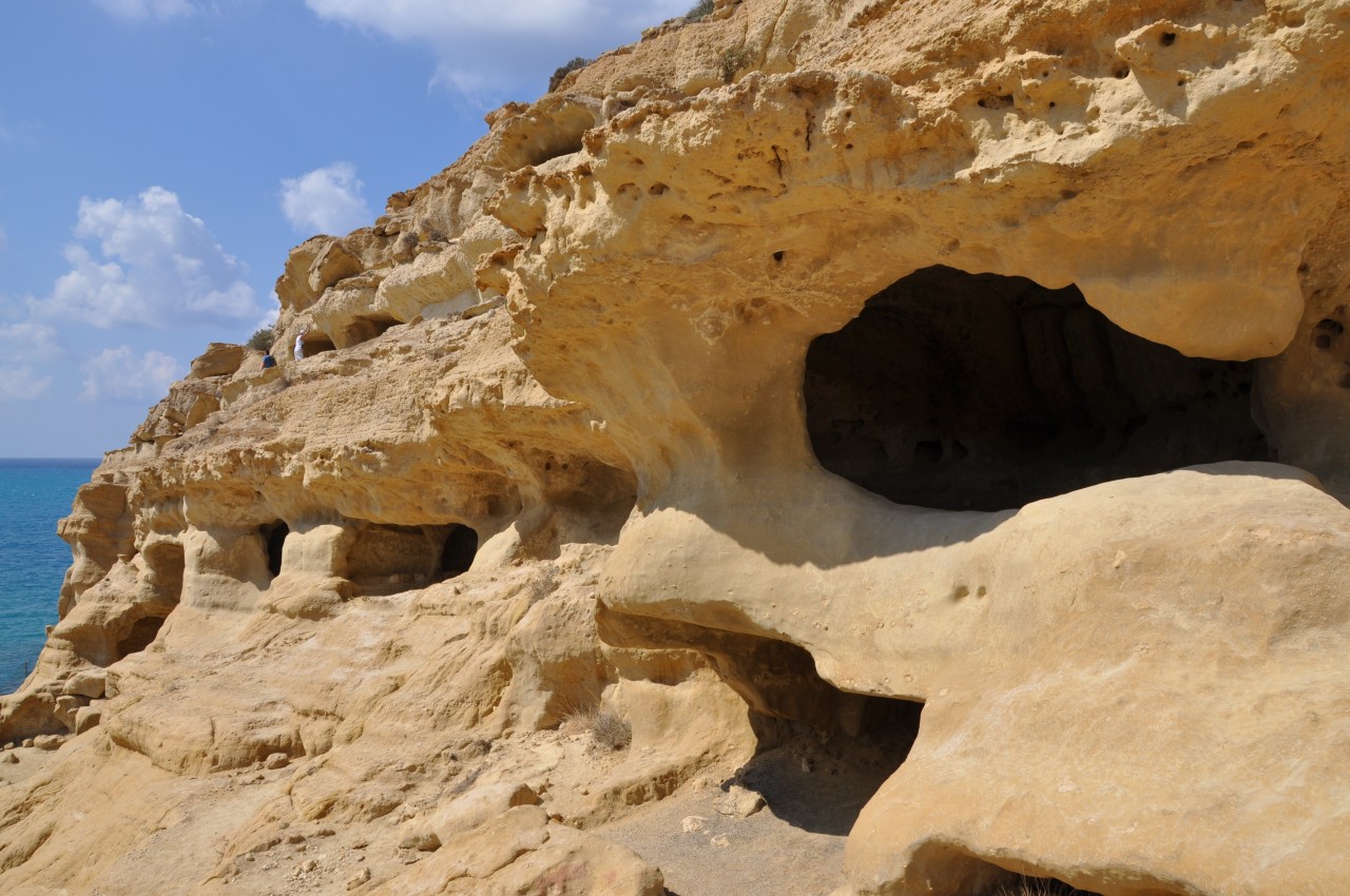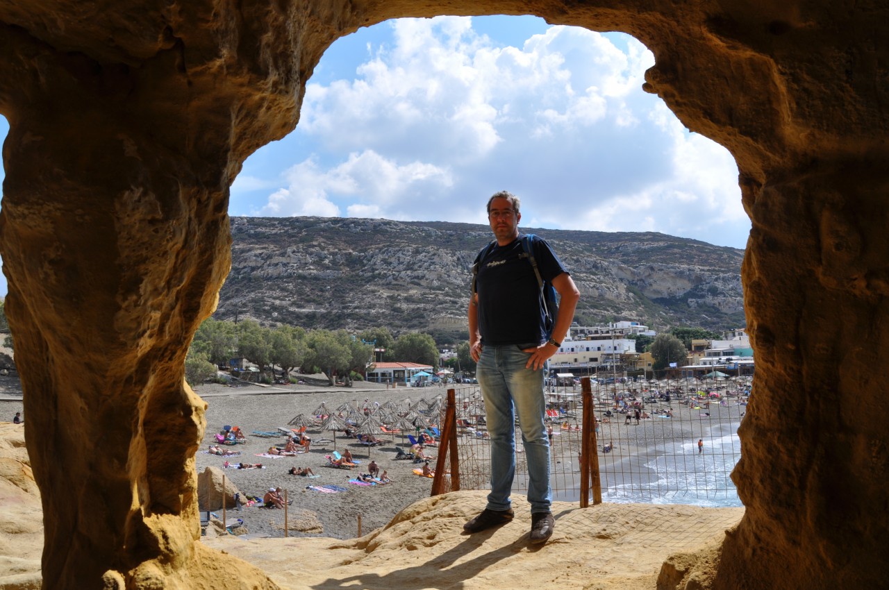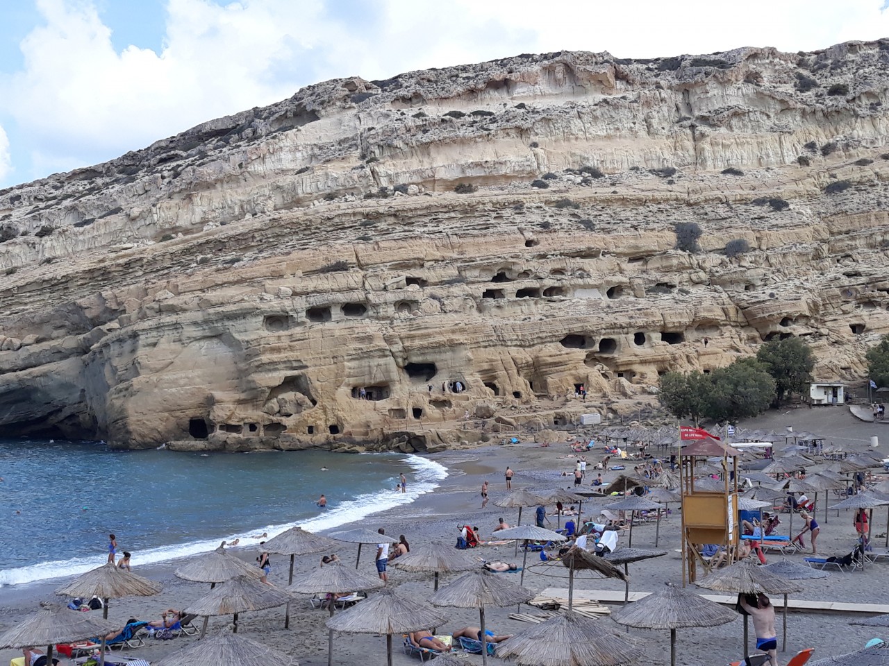 Aktuell sind wir in Matala, ca. 25 km südlich, trinken Frappé und schauen auf die alten Hippie-Höhlen, für die der Ort berühmt ist.