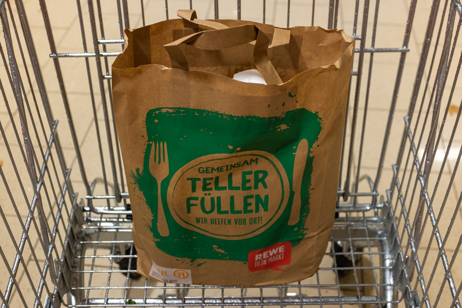 Tüten mit Lebensmittel kann man für 5 Euro kaufen. Der Inhalt dieser Tüten besteht aus: