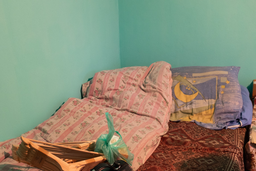 Im Zimmer nebenan wohnt eine Mutter mit vier Kindern. Drei Kinder sind da, es gibt 2 Betten für alle und hier noch nicht einmal einen Schrank. Das gesamte Hab und Gut befindet sich in einem Koffer. Ich leide mit, mir tut so etwas weh, wenn man das sehen muss.