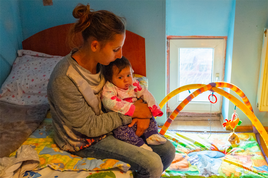 Wir treffen die Mutter mit ihren beiden Kindern zu Hause an. Das Baby ist erst wenige Monate alt, ihre Schwester ist knapp 5 Jahre. Der Vater lebt von Gelegenheitsarbeiten, da ist die Not groß.