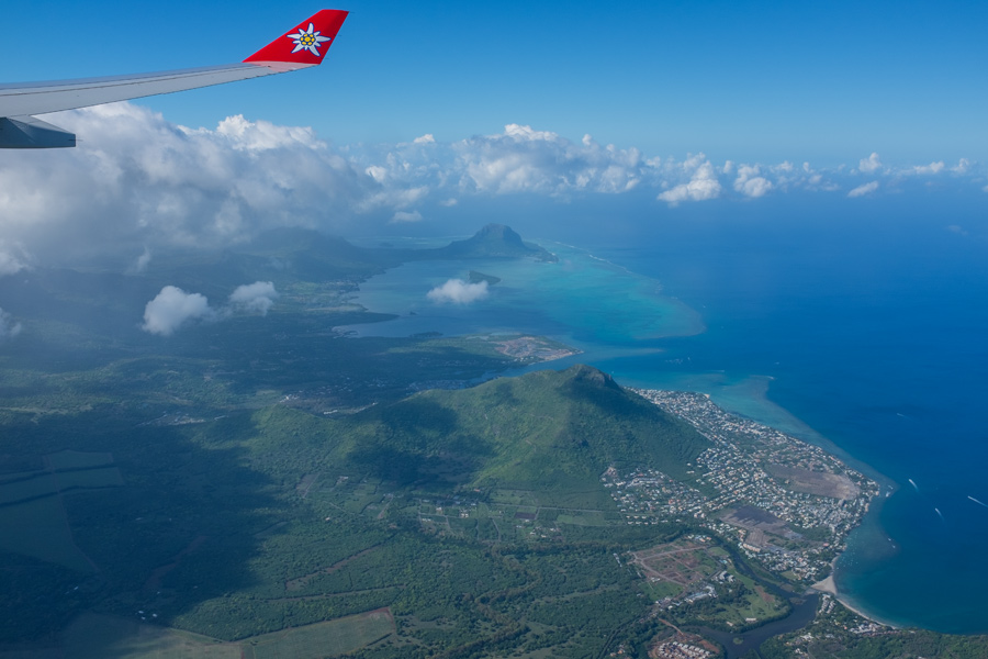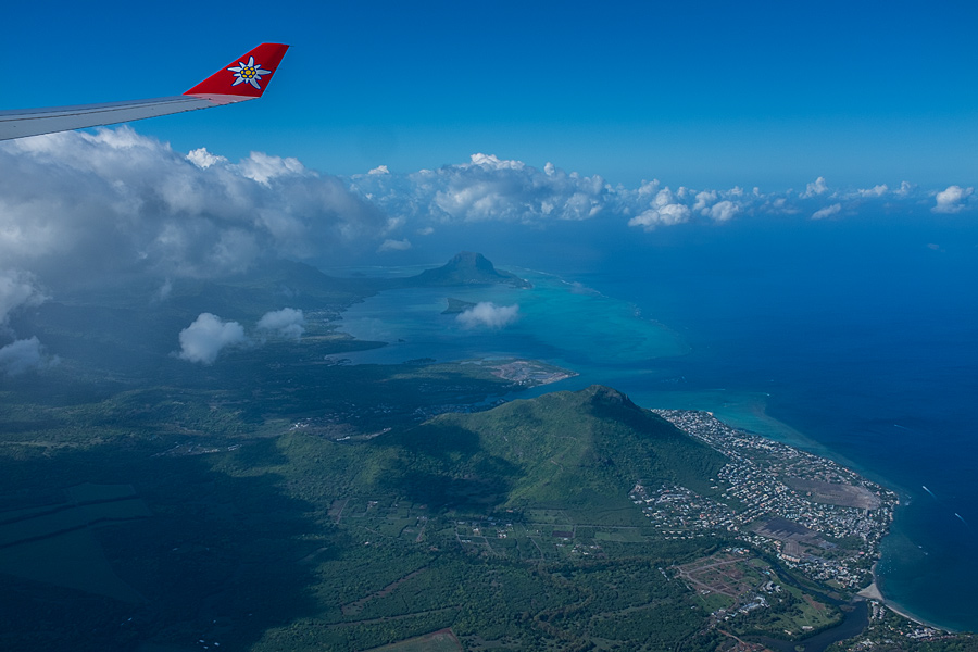 vor zwei Stunden sind wir hier auf Mauritius gelandet. Es war ein langer Flug, darüber berichte ich später noch. Hier erst einmal ein Eindruck aus der Luft. Wir hatten Glück mit der Sicht, als wir uns der Insel näherten.