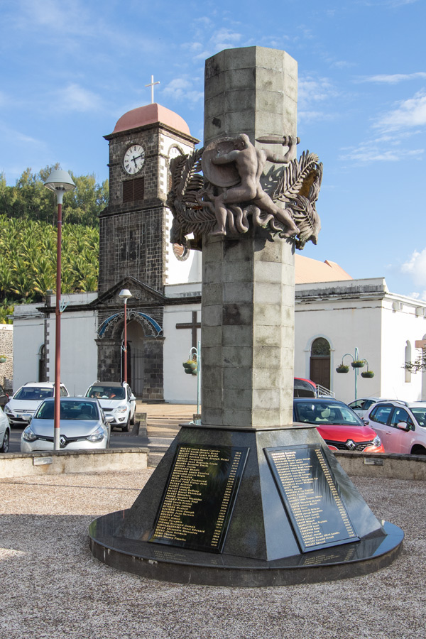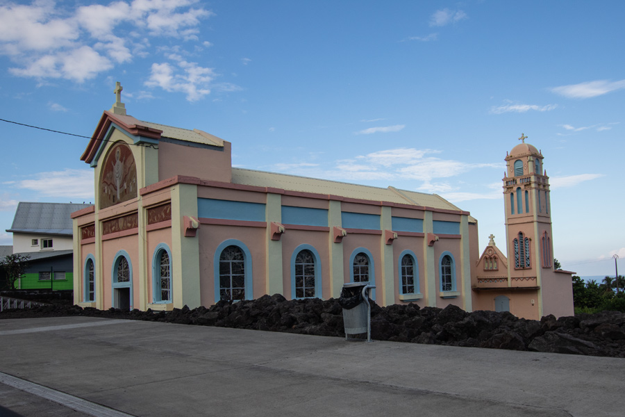 Die Kirche Notre-Dame-des-Laves blieb von dem Lavastrom 1977 wie durch ein Wunder verschont, die Lava suchte sich den Weg um die Kirche herum. (Bild 2)