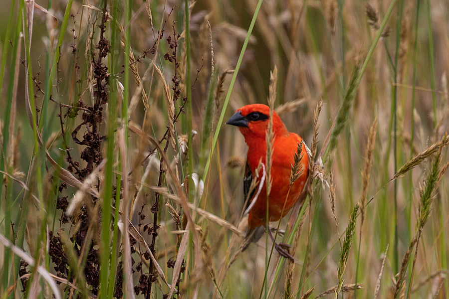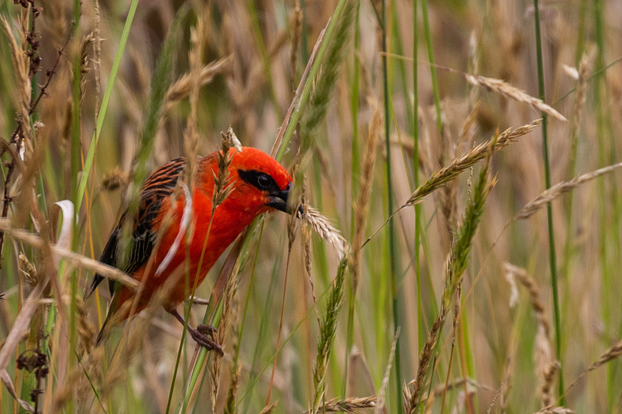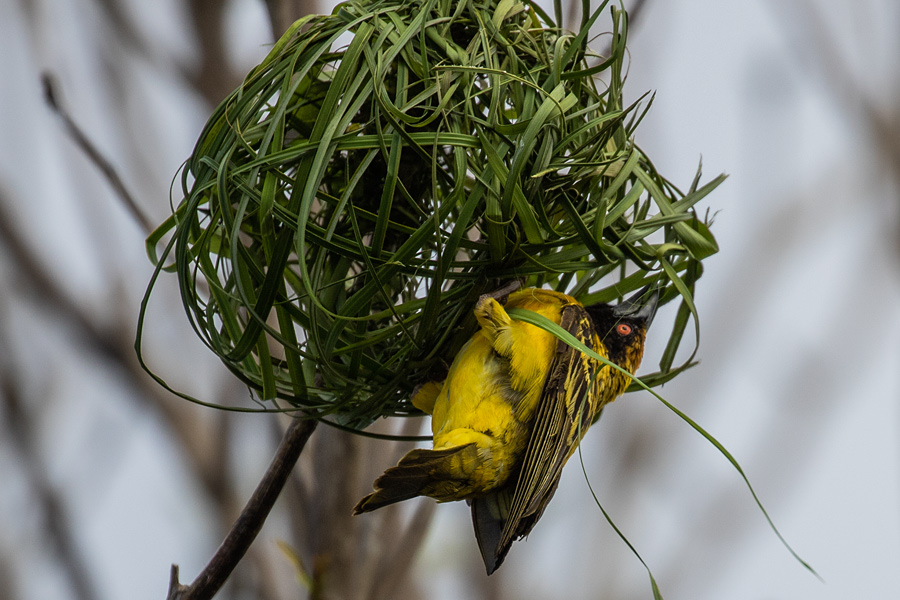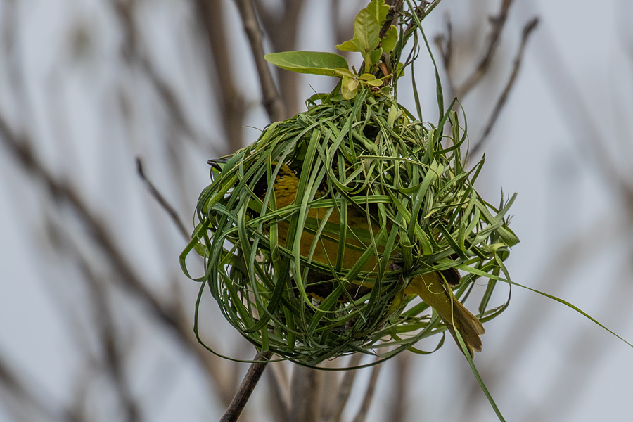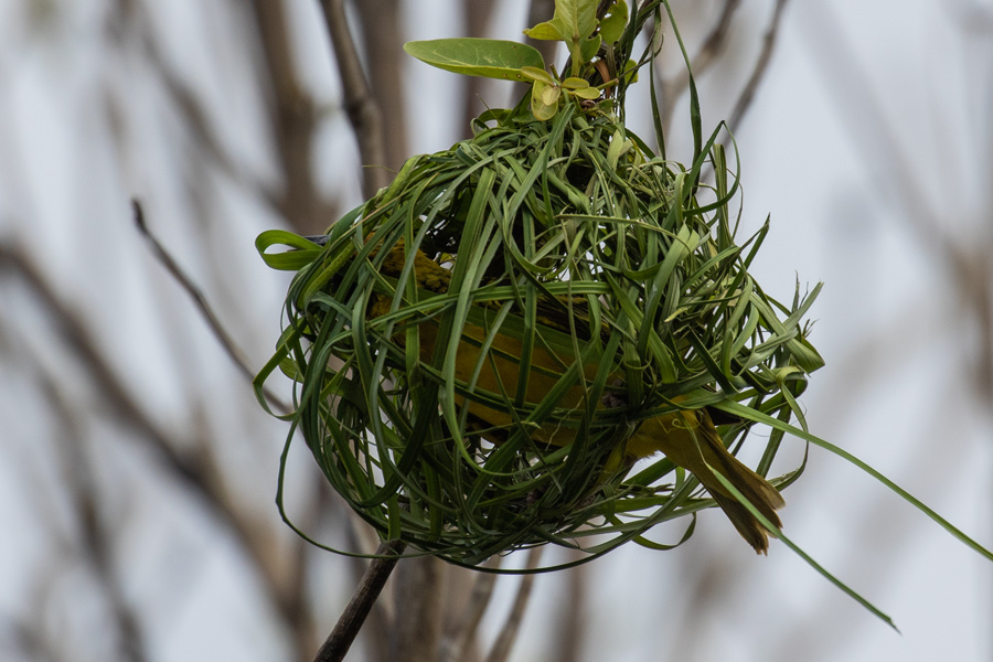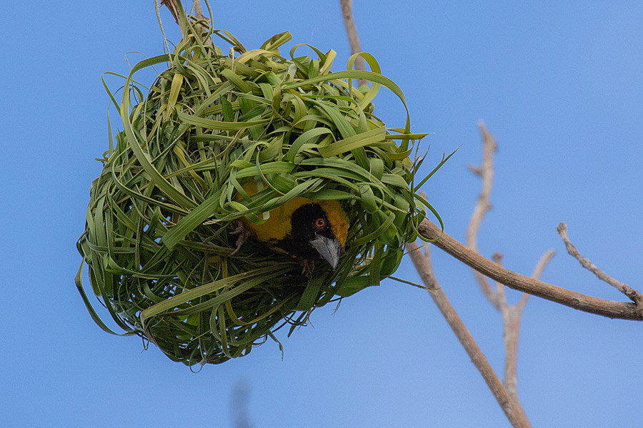 Die Webervögel sind richtig geschickt und ich konnte einen beim Weben beobachten. Auf dem vorletzten Bild sieht man die Schnabelspitze aus dem Nest rausragen, auf dem letzten Bild dann den Halm. Ich habe noch mehr Bilder von dieser Serie gemacht, aber es ist dann auch nur noch der Halm zusehen, mal größer mal kleiner.