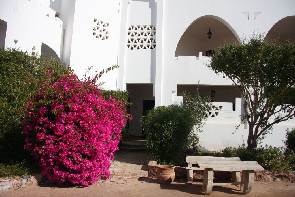 Hier seht ihr unser ZImmer von außen, das mit der lila Bourgainville umrandete