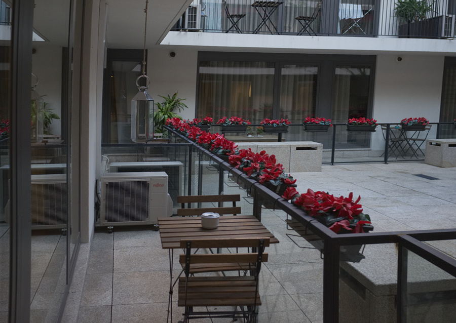 Wir sind sehr zufrieden, es gibt zwei Zimmer mit einer gut eingerichteten Küchenzeile, sogar eine Waschmaschine ist vorhanden, die wir aber ganz bestimmt nicht benutzen werden. Für Raucher wäre auch gesorgt, es gibt einen Balkon zum Innenhof und vor der Eingangstüre auch eine Sitzgelegenheit mit Aschenbecher.