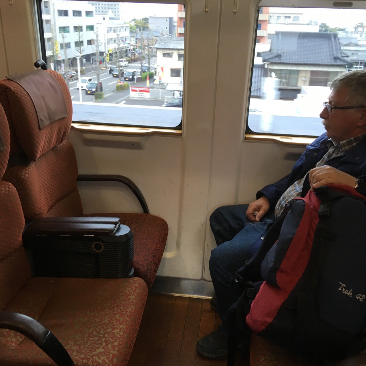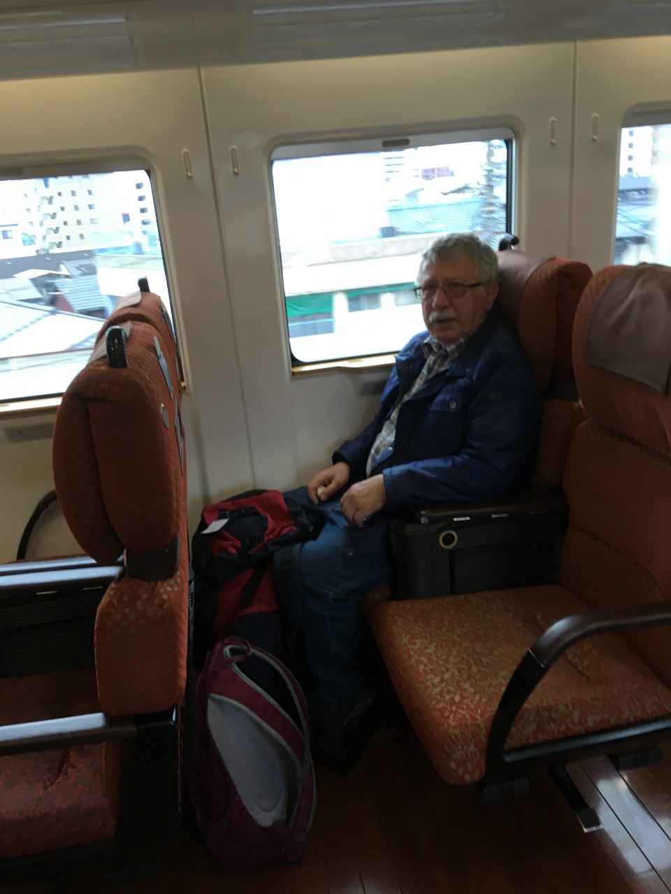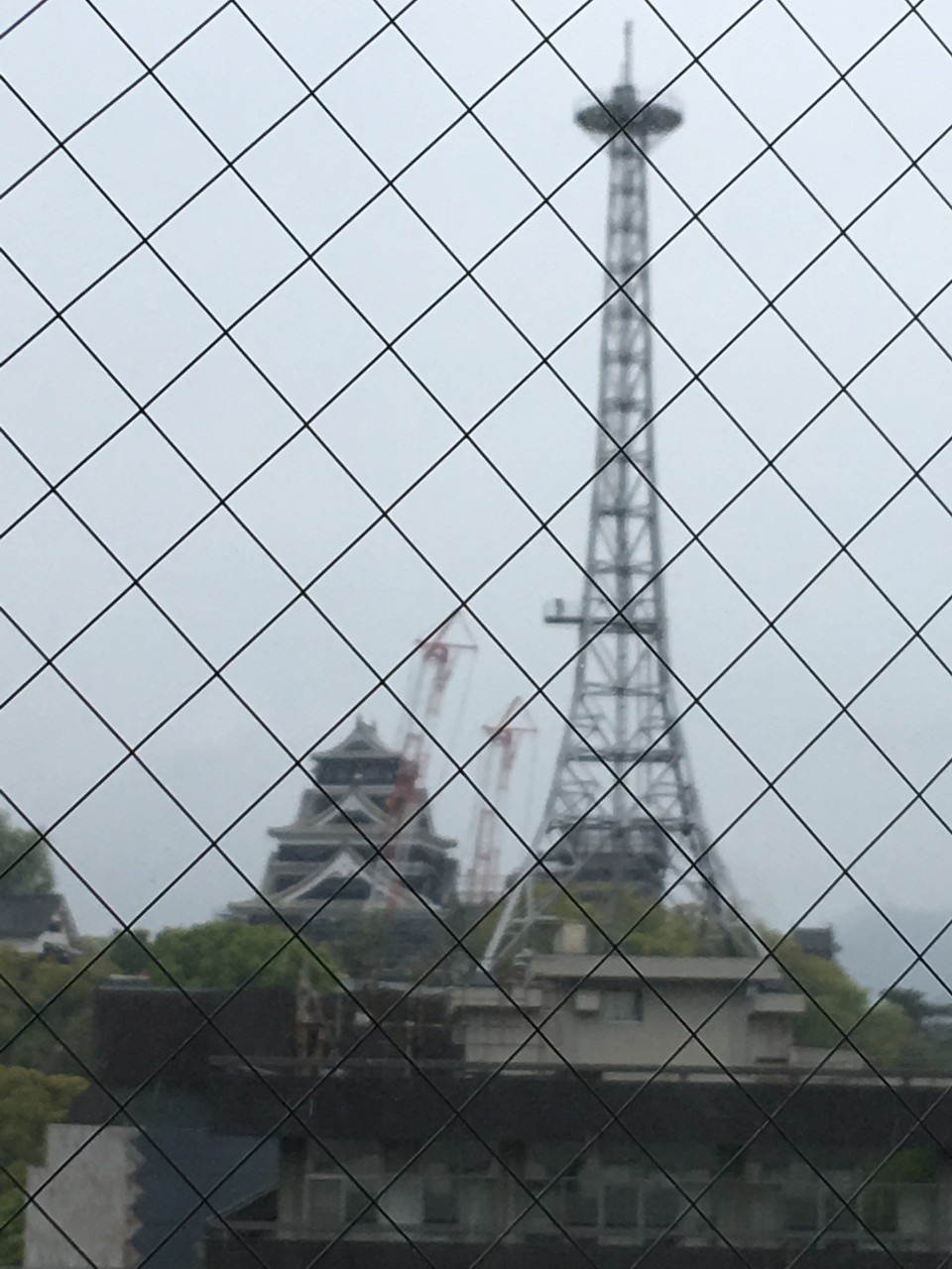 Die Sitze in den Zügen kann man nach Belieben drehen. In Fahrtrichtung, oder zu einander oder auch rückwärts. In Kuramoto angekommen , Haben wir erst einmal etwas gegessen. Meins war nicht so gut, mit viel zäher Hühnchen Leber , Jörgs war besser. Jetzt sitzen wir im Hotel mit Blick auf das Schloss. Leider können wir nicht rein, denn es wurde beim letzten Erdbeben beschädigt. Wir machen 1 Stunde Pause, hoffentlich regnet es dann nicht mehr. Die Drahtverstärkungen im Glas sind zu sehen