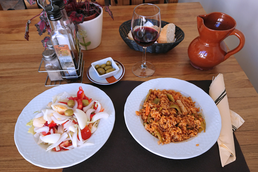 Im Hostal-Bar Restaurante "La Fuente" habe ich ein Zimmer mit Bad gebucht. Am Abend esse ich das Pilgermenü zu 12 Euro, sehr lecker und es gibt eine große Auswahl an vegetarischen Speisen. Ich darf mir zwei Gänge aussuchen und dann gibt es noch ein Dessert und der halbe Liter Wein ist auch inbegriffen. Natürlich bekomme ich auch Brot und Oliven.