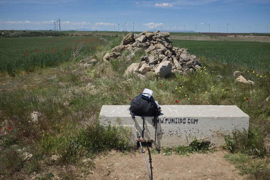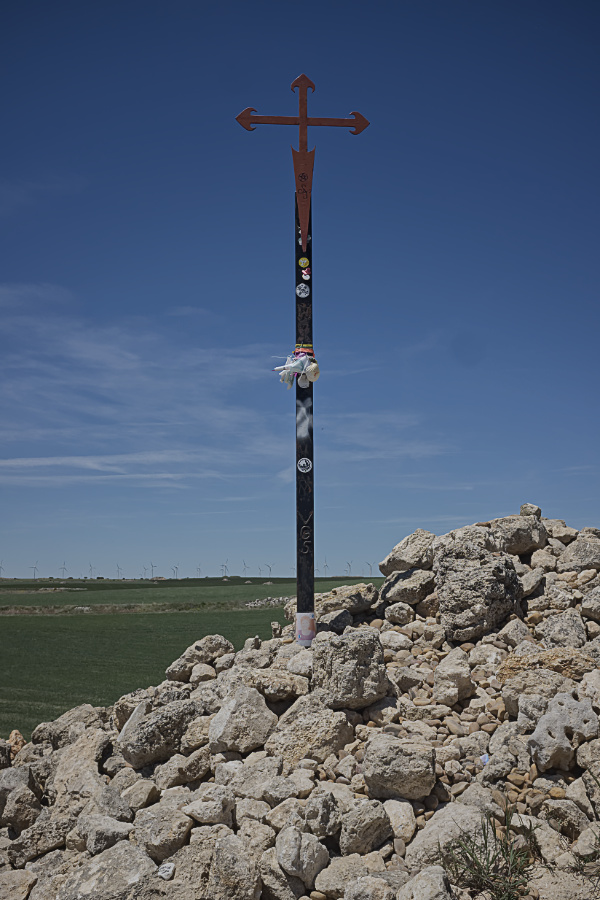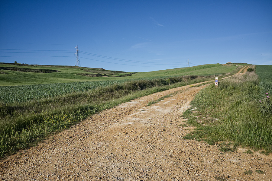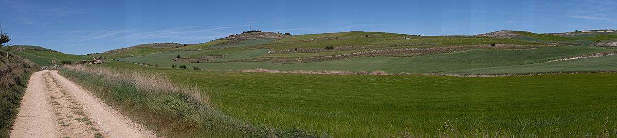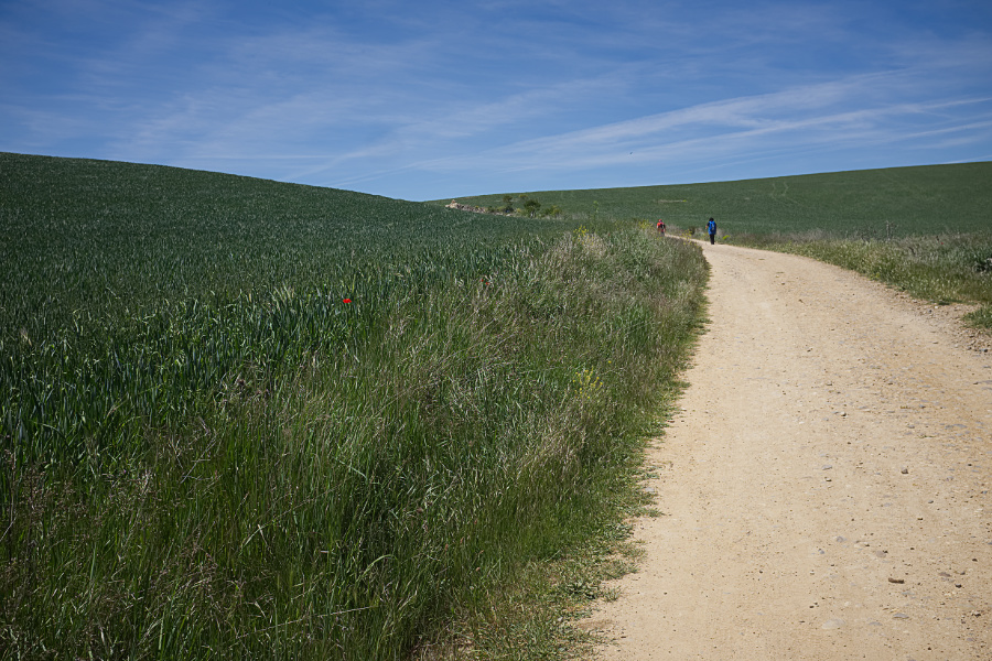 Der Weg führt nun durch die Meseta, das ist eine Hochebene (ca 800 m), man geht also stetig erst einmal bergan. Schon nach kurzer Zeit kann ich die ersten Sachen wieder ausziehen, denn es zeigt sich keine Wolke am Himmel und die Sonne ist schon da.