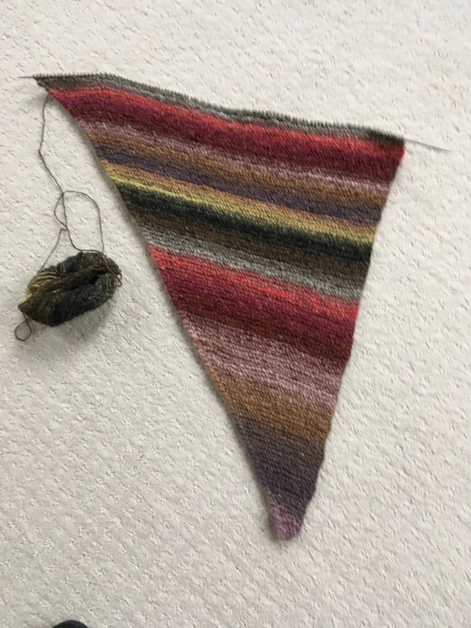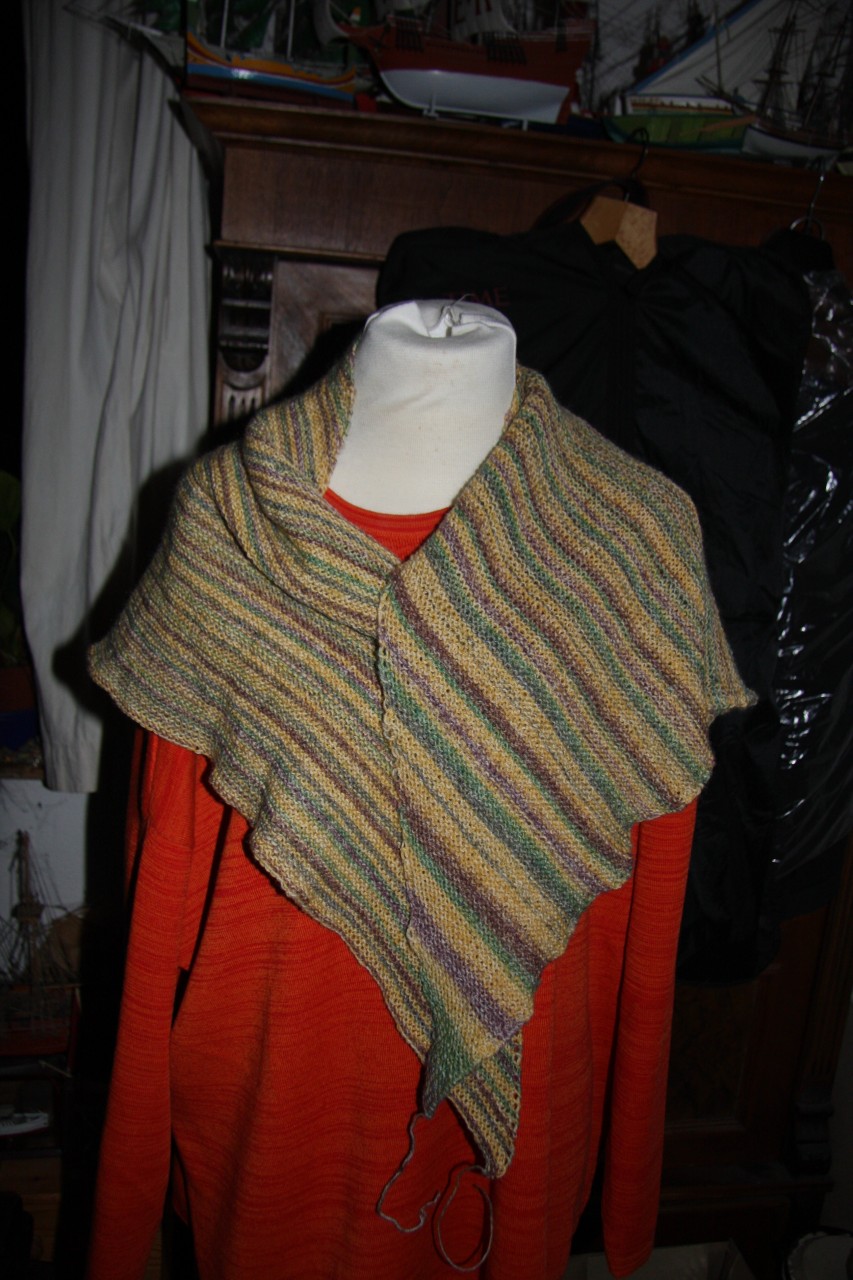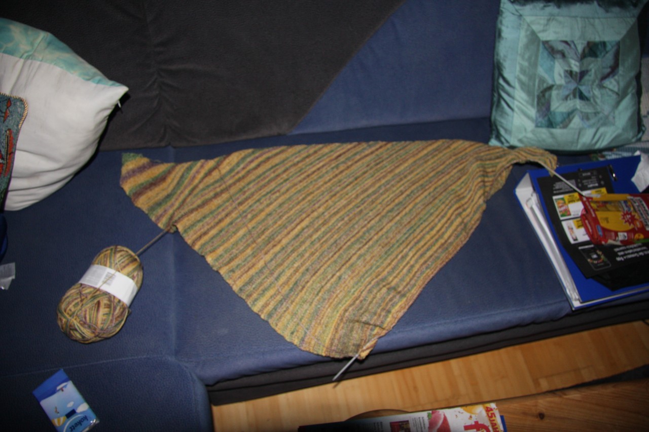 So ein Mist, gerade entdecken ich ein Loch im Tuch - vor ca. 6 Reihen muss ich irgendwie eine Masche verloren haben. Ich habe versucht das irgendwie zu reparieren, aber es sieht einfach blöd aus. Ich werde morgen rippeln müssen. Das ist bitter - bei so mühsam gestrickten Reihen mit der dünnen Wolle.