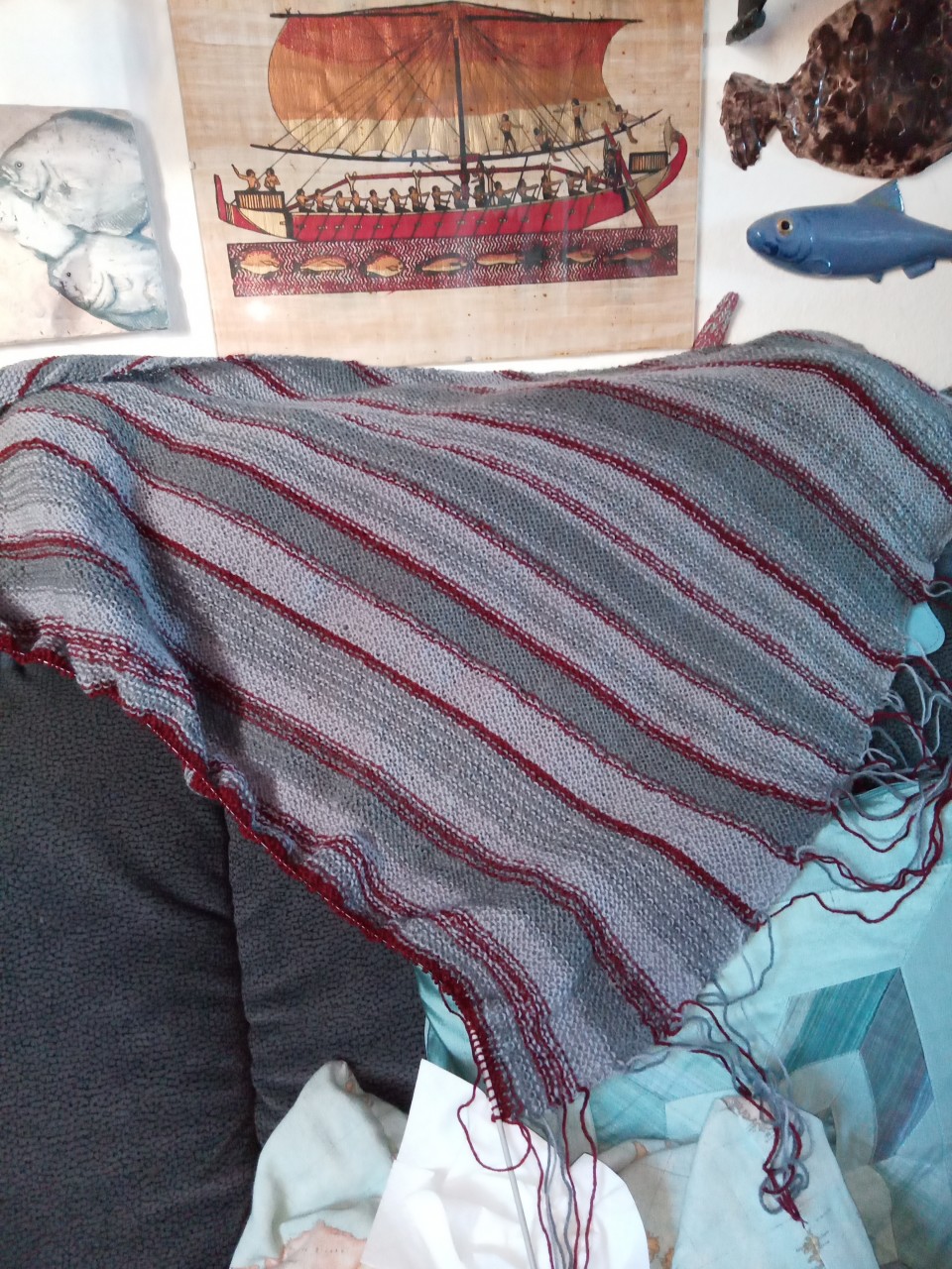 Es wurde grau gewünscht. Ich finde durch den weinroten Streifen ist es belebter. Bis zum 28.2 muss es fertig sein, aber das wird schon klappen