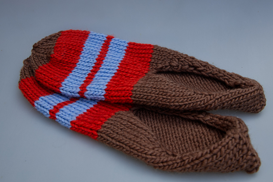 Die Spitze habe ich dann wieder in braun gestrickt, es werden jeweils die ersten beiden Maschen jeder Nadel rechts zusammengestrickt, bis nur noch 2 Maschen auf jeder Nadel sind. Die letzten Maschen zusammenziehen und den Faden innen vernähen.