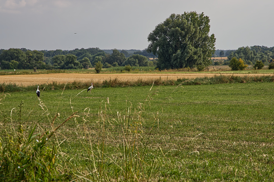 Rechts und links der Weser ist Naturschutzgebiet. Ich hatte natürlich kein "Rohr" mit, daher gibt es die Störche nur von Weitem. Wir haben noch etliche andere Vögel gesehen, Kormorane, Fischreiher und vieles mehr.