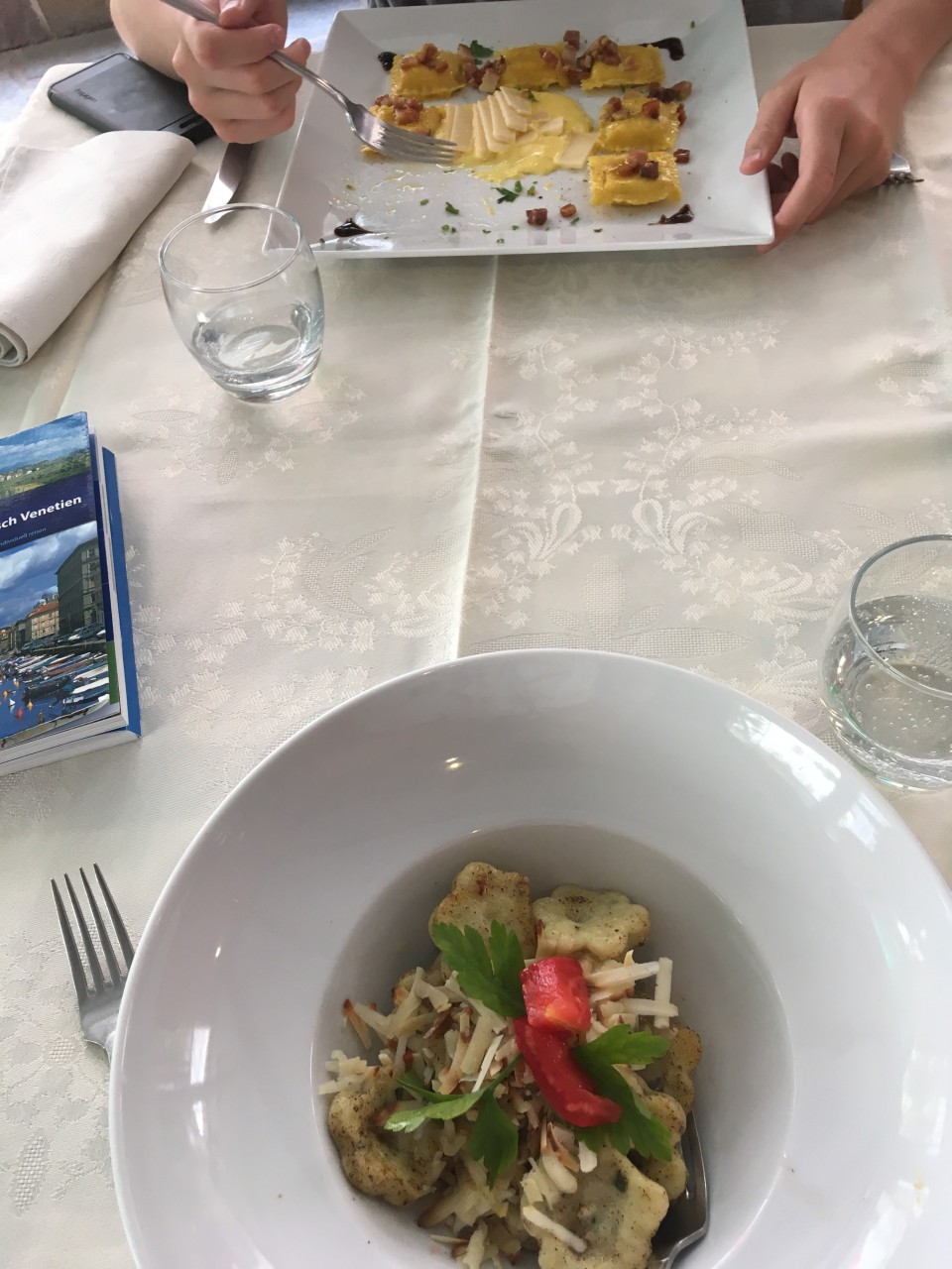 Ja, das waren gefüllte Nudeln und vorne diese Blümchen sind Ricotta Gnocchi.