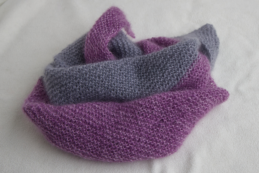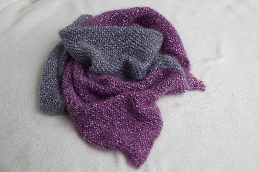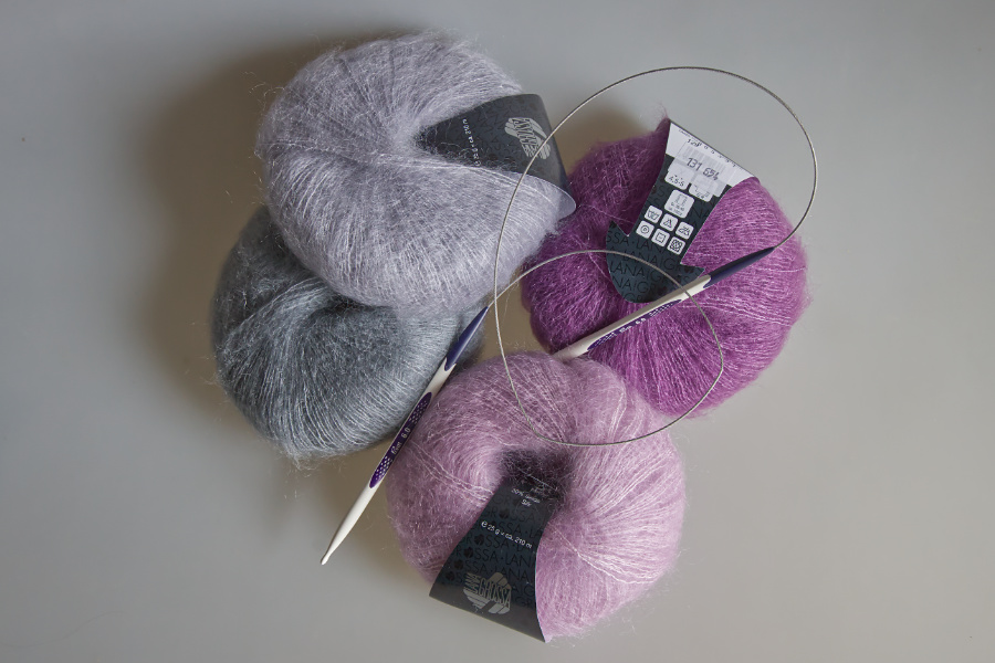 Nun zum Material: je 1 Knäuel Silkhair (Lana Grossa) 70% Mohair und 30% Seide in den Farben Graphitgrau, Graulila, Flieder und Violett bei Junghans-Wolle bestellt.