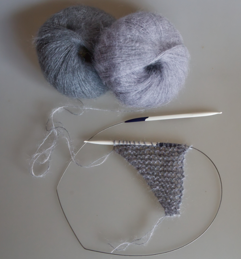 Ich stricke mit doppeltem Faden und zwar mit den Farben Graphitgrau und Graulia: