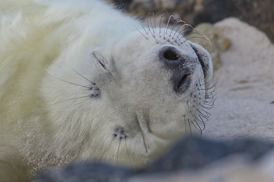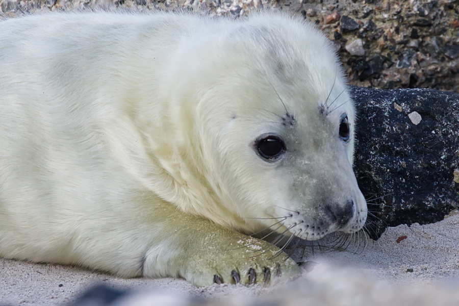 Dann entdeckte ich dieses putzige Kerlchen, es kam gerade hinter einem Felsen hervor und man sah, dass es gerade erst ein paar Tage alt war, noch ziemlich unbeholfen, denn später robbte es zur Mutter und fand einfach nicht die Milchquelle. Die Mutter mühte sich ab und nach langem hin und her, nuckelte es zufrieden und schaute mit seinen dunklen Augen über die Mutter hinweg. Das war schon drollig.