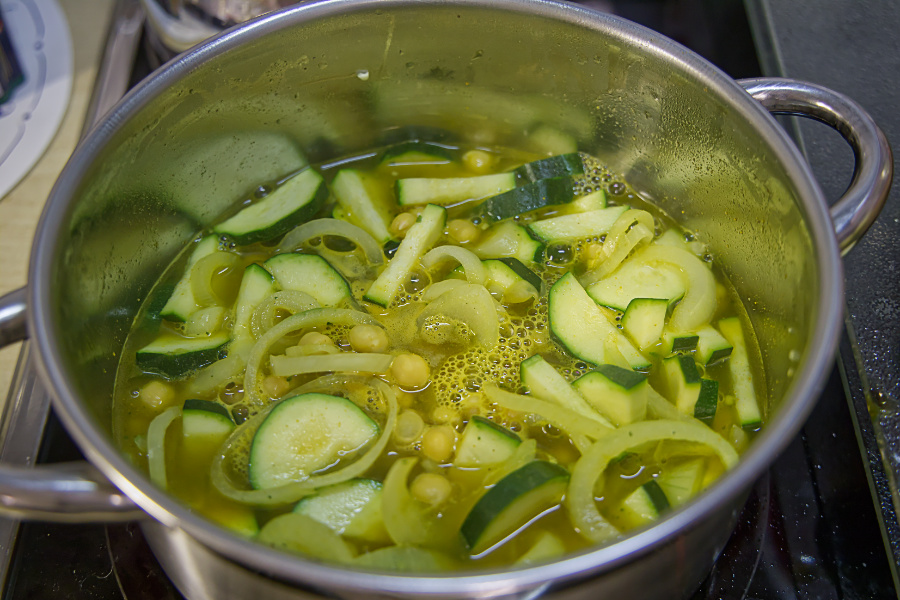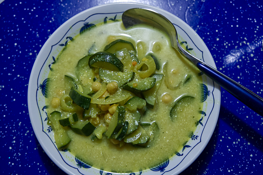 Ich habe heute eine Suppe nachgekocht und sie hat uns super geschmeckt: Zwiebeln, Zucchini, Knoblauch Kichererbsen, Cumin und Kurkuma sind die Haupt-Zutaten, neben Joghurt und Zitronensaft.