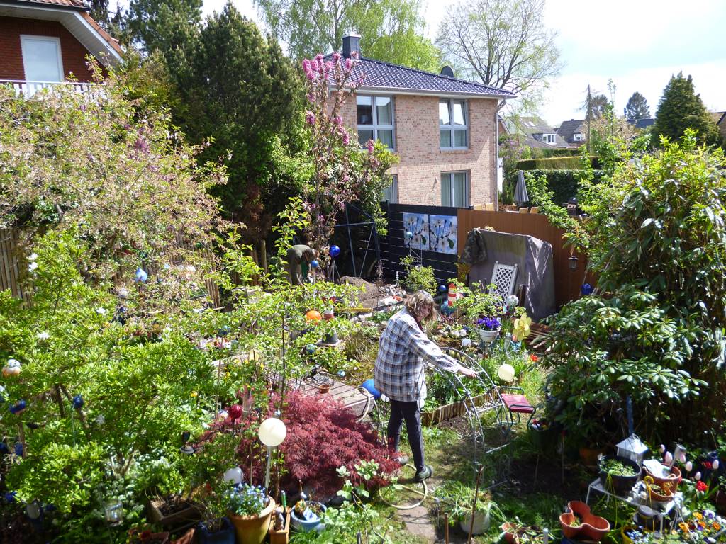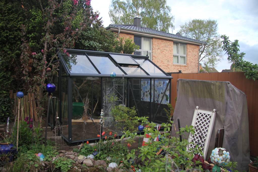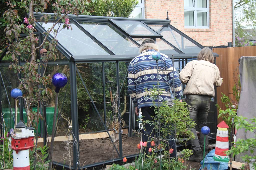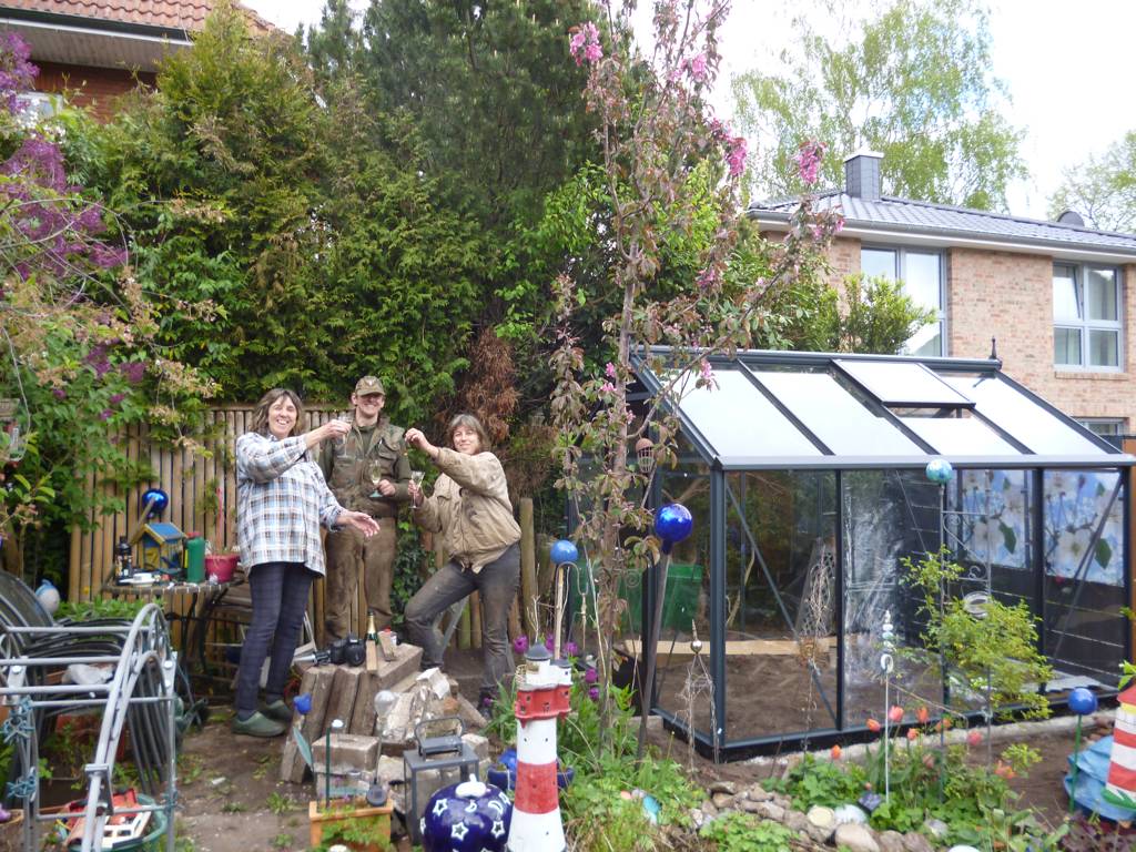 Aber das finde ich nicht gut - links daneben habe ich einen Grundstücksbereich, der mir gar nichts bringt. So würde die Tür da geöffnet werden, wo der Strandkorb steht. Den müsste man als ebenfalls verschieben. Der Sitzplatz vor dem Gewächshaus neben dem Strandkorb geht verloren.