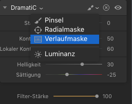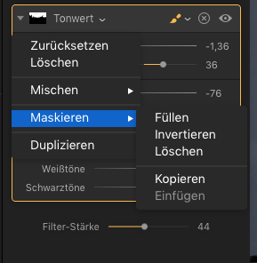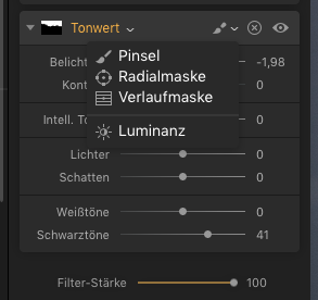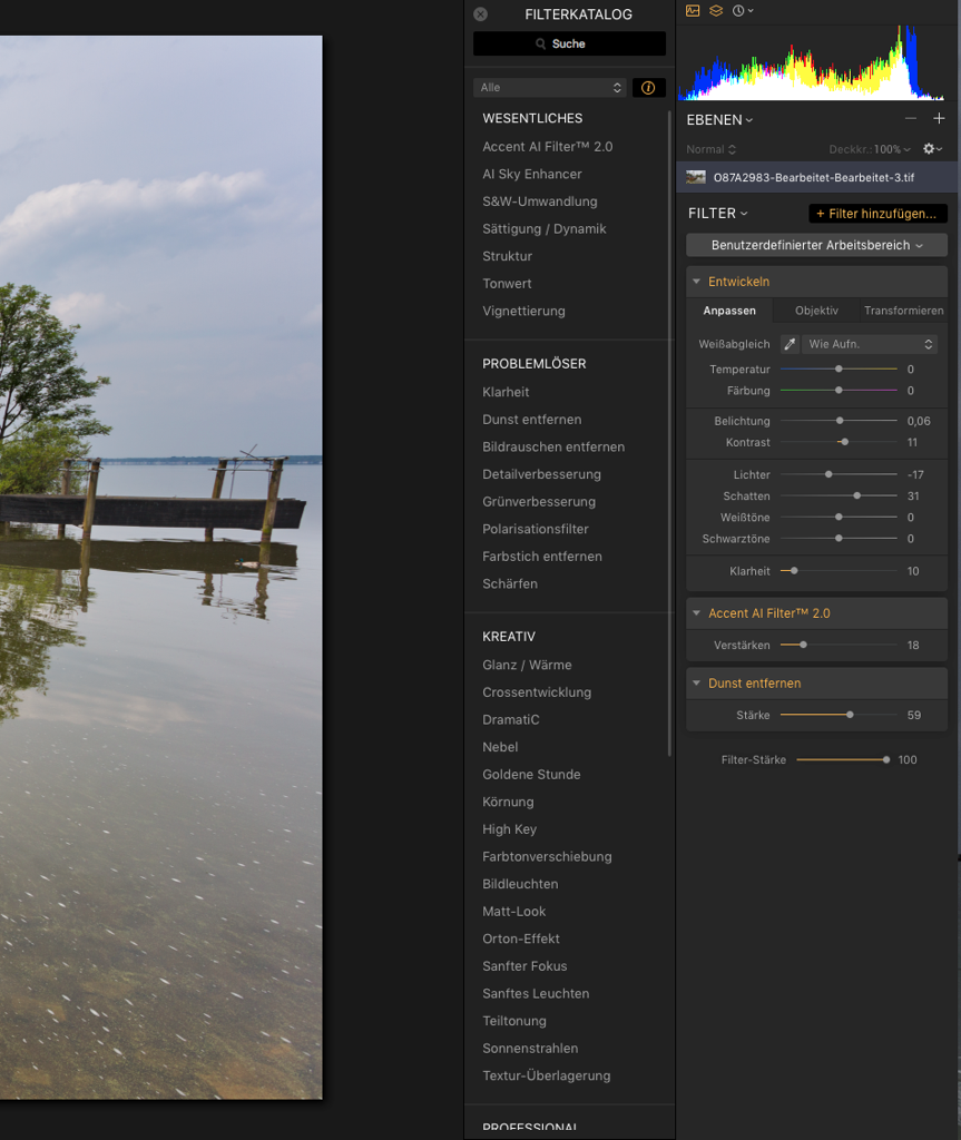 Unter dem Histogramm befindet sich das Feld zum Anklicken für die verschiedenen Filter