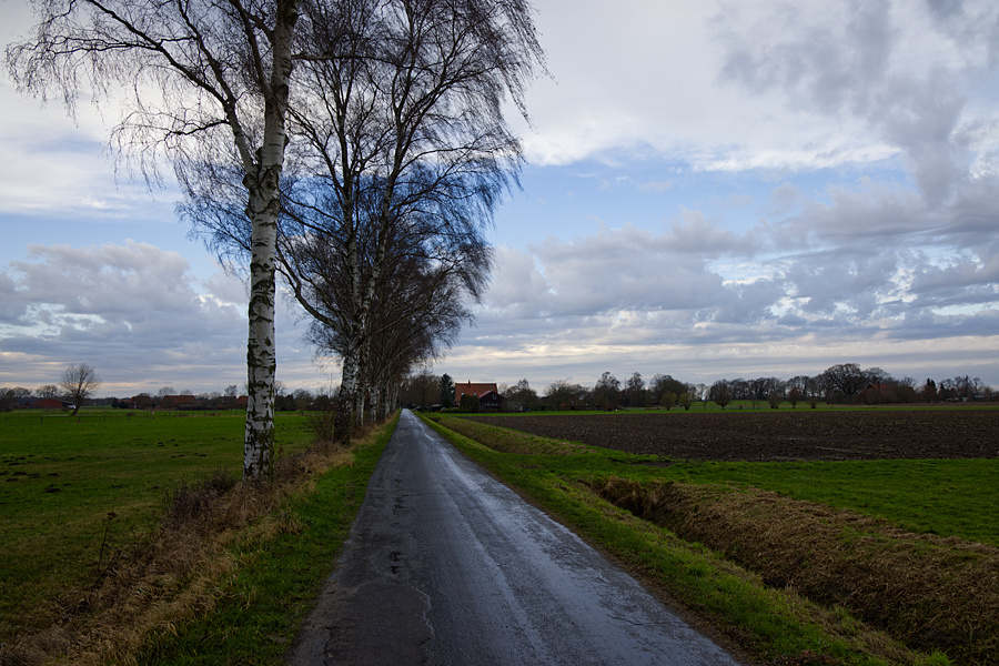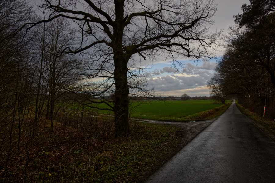 Wir verlassen Loccum und es geht siebeneinhalb Kilometer auf einsamen Wegen durch den Loccumer Wald. Der Regen erwischt uns, aber wir haben beide regenfeste Klamotten an. Zur Not haben wir auch noch einen Regenumhang mit, den haben wir aber nicht angezogen.