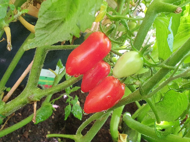 Und die Triebe der Datteltomaten, die ich - nach dem Kahlschlag - noch in den Garten gesetzt habe, sind inzwischen abgeknickt. Angeblich brauchen diese keine Stütze, hängen aber übervoll.