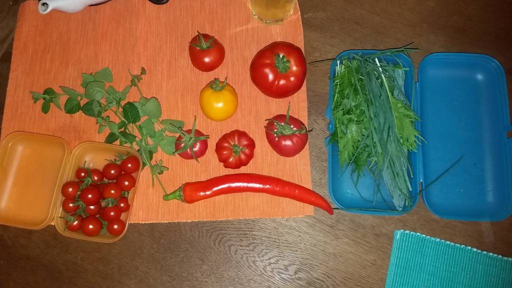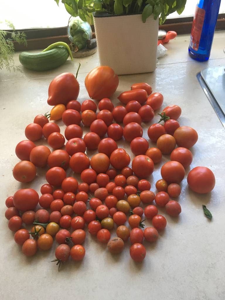 Heute ca. 3 Kilo, hauptsächlich Datteltomaten - was für ein Pflückaufwand und Geschnibbel!