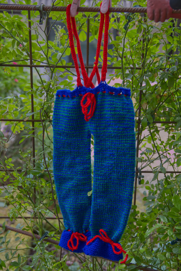 Wie viele Maschen ich benötigte habe ich an Hand des Umfangs und der Länge der Beine ausgemessen und dann in Maschen umgerechnet. Den Bund habe ich nur in blau in Runden im Rippenmuster gestrickt.