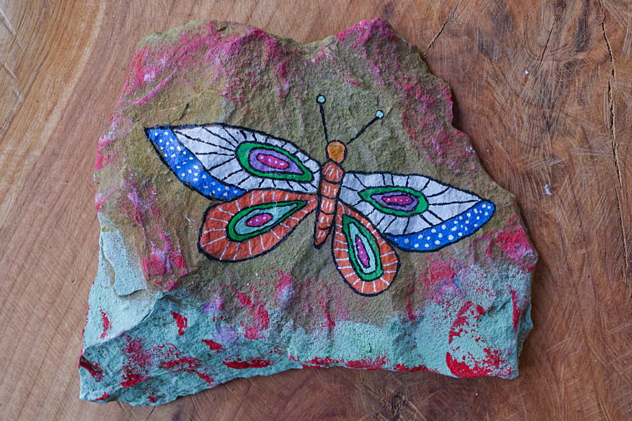 2020 habe ich den Schmetterling im Beitrag 3 gemalt. Nach sechs Jahren waren die Farben größtenteils abgeblättert, daher habe ich ihn in den letzten Tagen neu bemalt. Dabei sind mir einmal ein roter Acrylstift und ein anderes Mal ein blauer Stift ausgelaufen und haben den Stein verschmiert. Der Stein hat die Farbe sofort aufgenommen und ließ sich nicht mehr abwaschen. Deshalb habe ich rund um den Schmetterling ein wenig weitergemalt, sodass die Flecken harmonisch in das Gesamtbild übergehen.