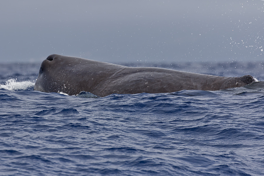 Dann sahen wir auch noch einen Pottwal (Physeter macrocephalus), das ist der drittgrößte Wal, er ist ungefähr 12 m lang. Hier hatten wir etwas mehr Glück mit dem Fotografieren. Man muss bedenken, dass das Boot immer zu hoch und runter geht und der Wal ist mal zu sehen und mal nicht, dann muss man sich auch noch festhalten und die Kamera bedienen. Alles kein leichtes Unterfangen.