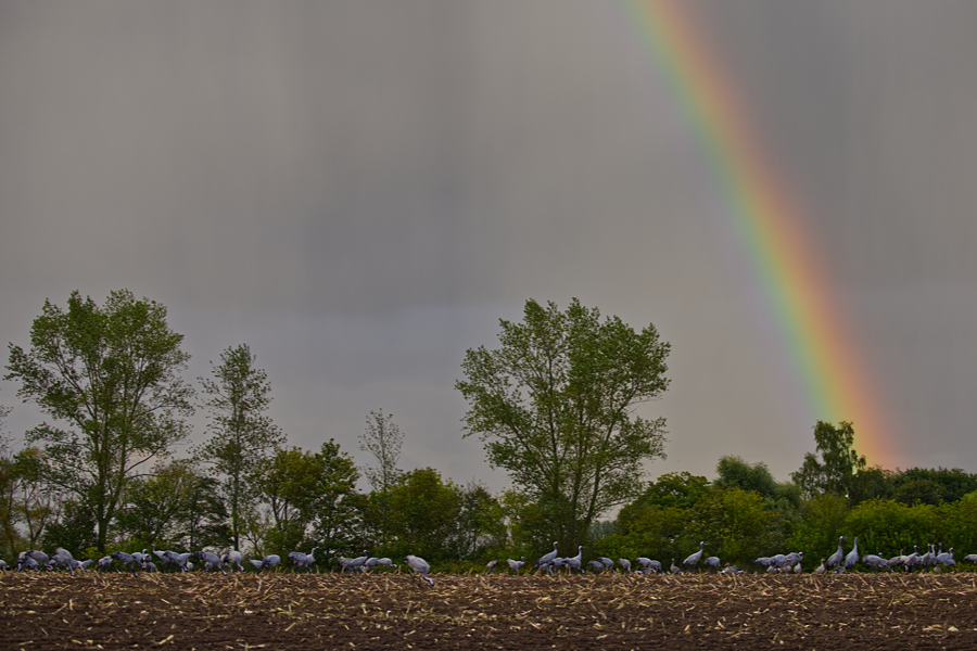 Vom Kranichzentrum in Groß Mohrdorf fuhren wir weiter in Richtung Kranorama. Unterwegs sahen wir ein paar Kraniche auf einem Feld stehen. Da wir unsere Fotoapparate noch im Rucksack verpackt hatten, fuhr Kathrin ein Stück weiter, so dass die Kraniche nicht sehen konnten, dass wir anhielten. Sobald man anhält und dann auch noch aussteigt und rumkramt, fliegen die Kraniche weg.