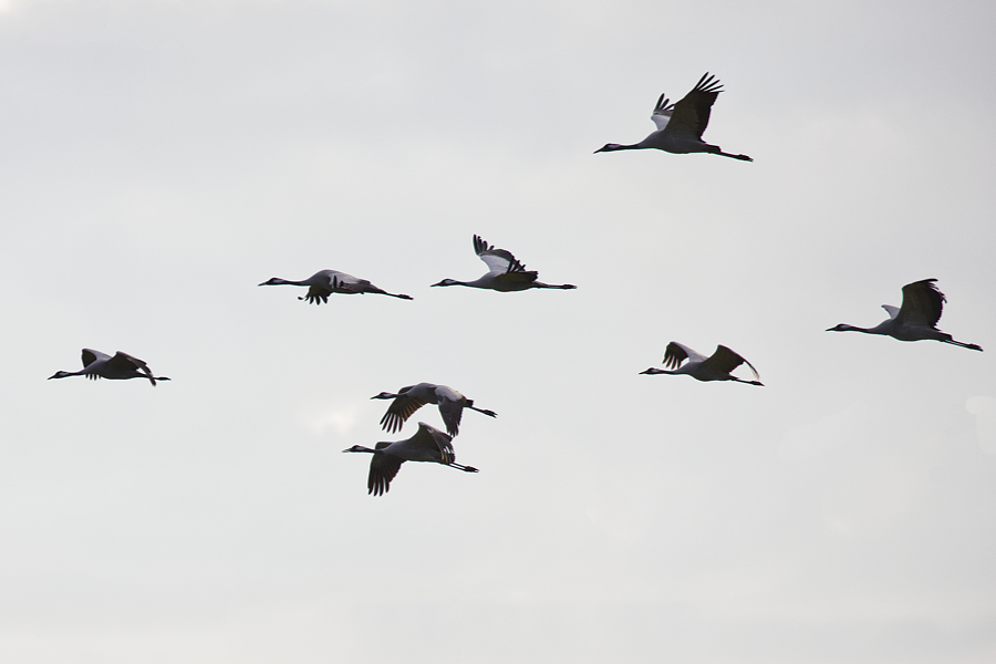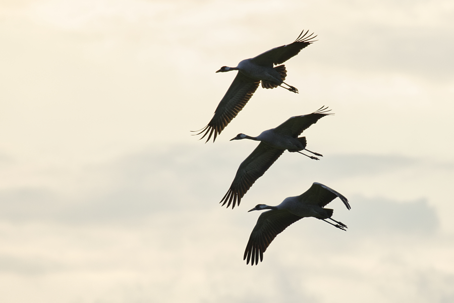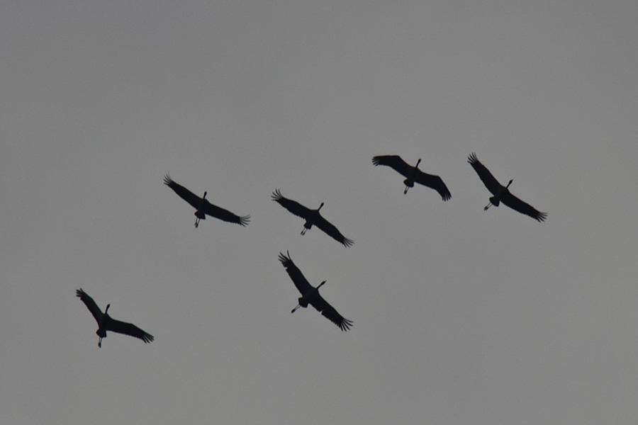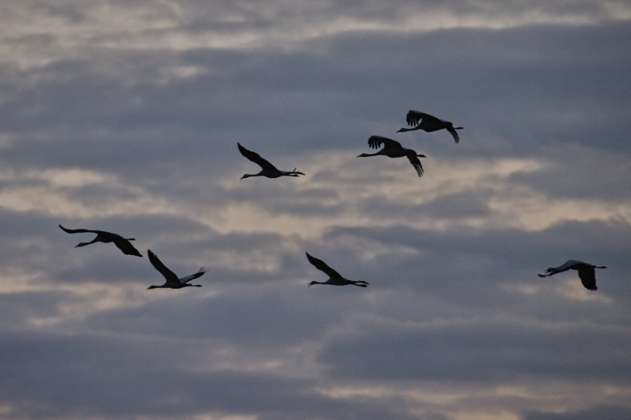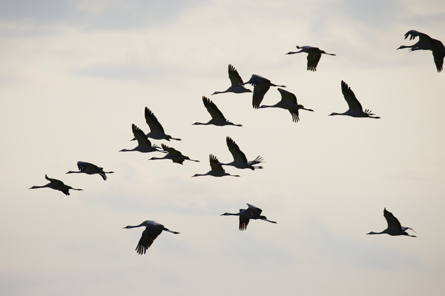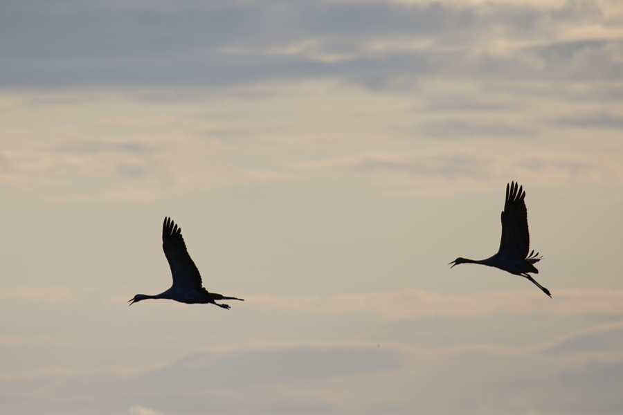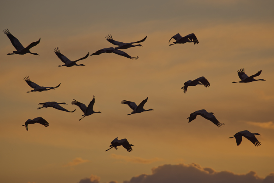 Jetzt bei den Kranichen habe ich es wieder bemerkt. Fotografiert man gegen einen hellen Himmel, dann sieht man Silhouetten (Schattenriss oder auch Scherenschnitt) Ich denke, jeder hat schon einmal solche Bilder gemacht.