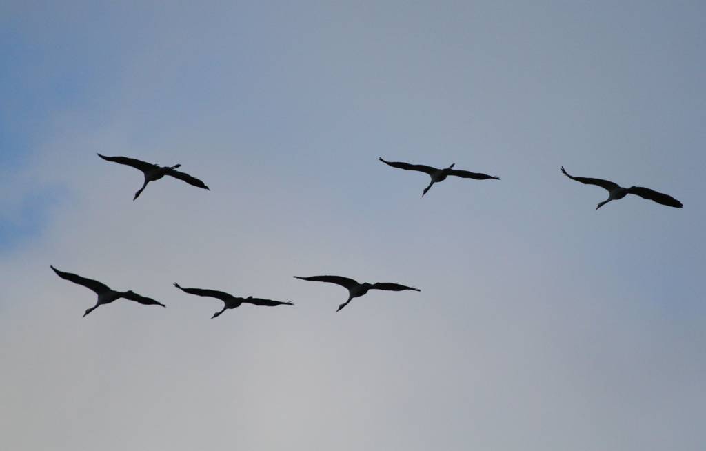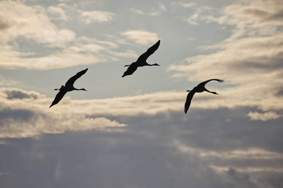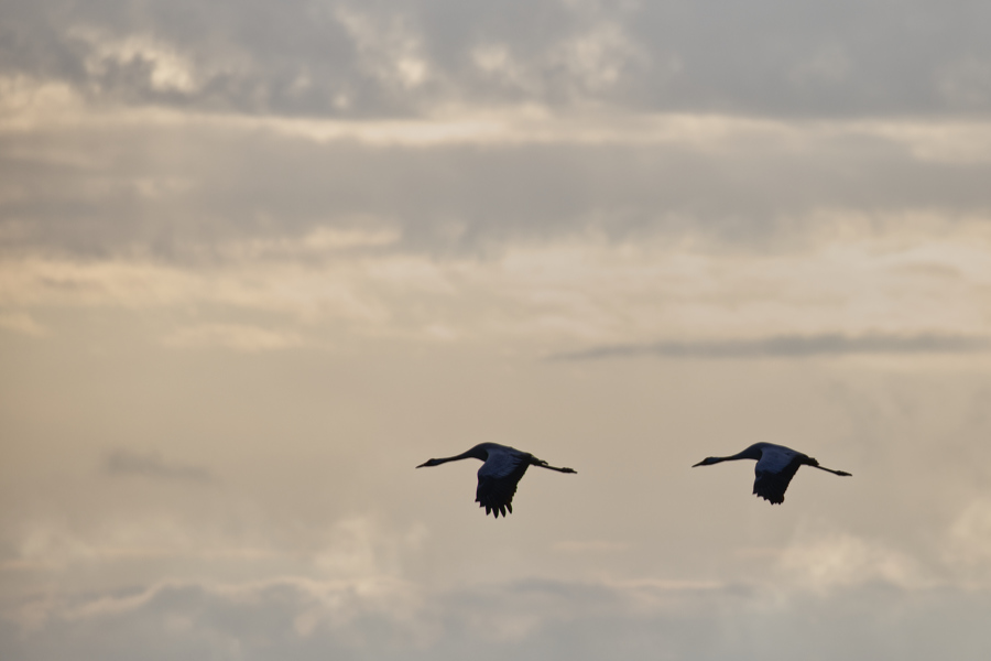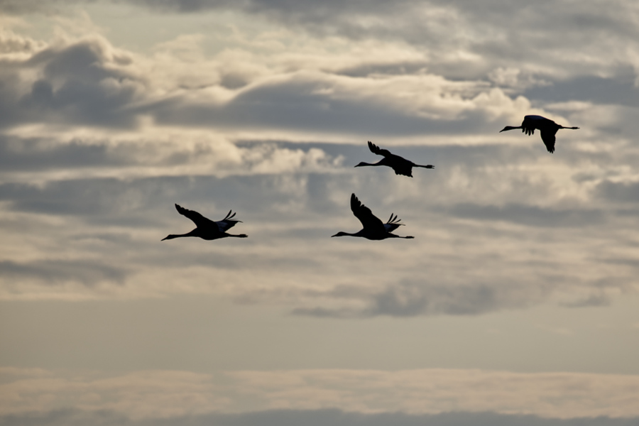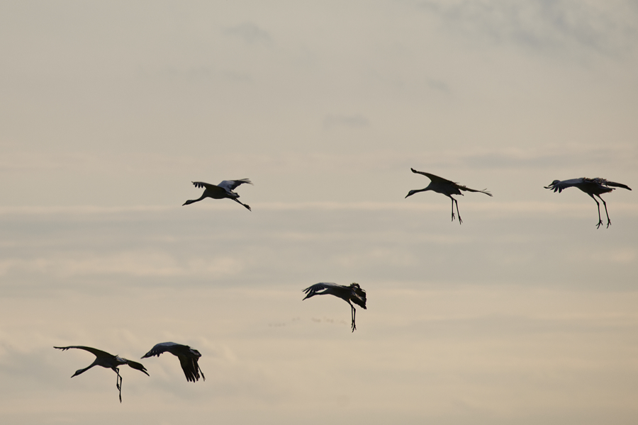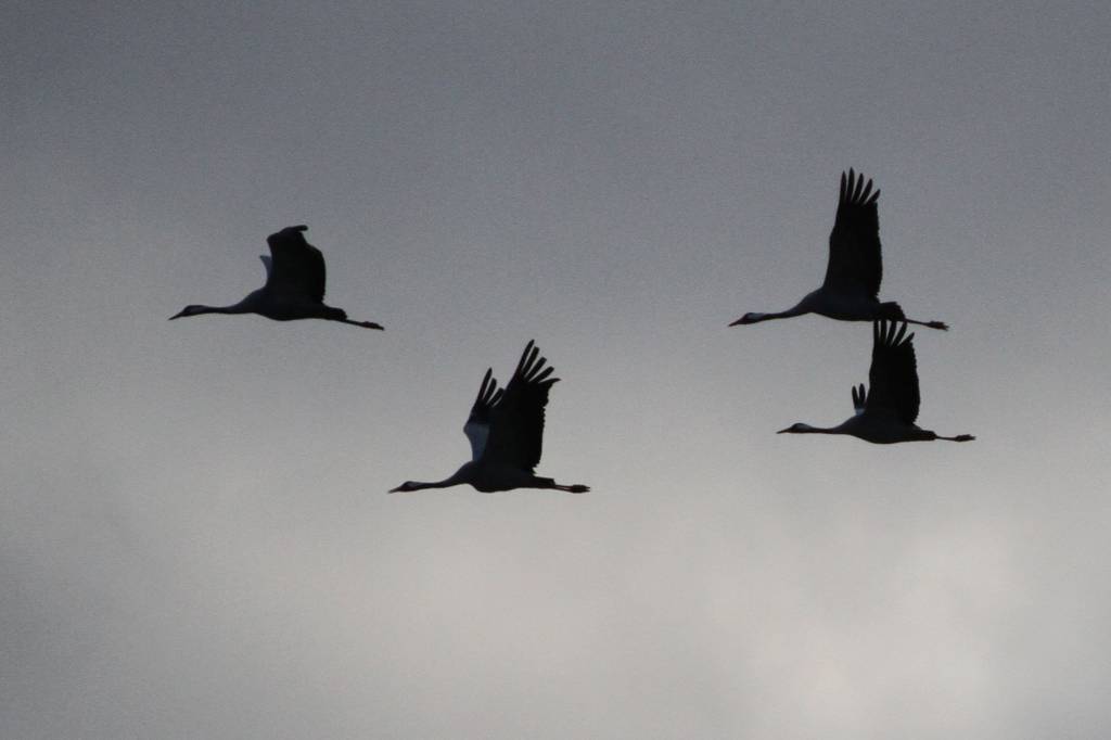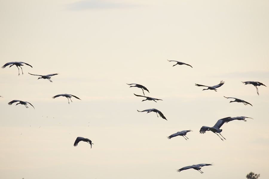 Jetzt bei den Kranichen habe ich es wieder bemerkt. Fotografiert man gegen einen hellen Himmel, dann sieht man Silhouetten (Schattenriss oder auch Scherenschnitt) Ich denke, jeder hat schon einmal solche Bilder gemacht.