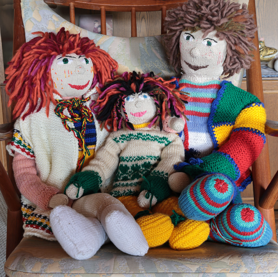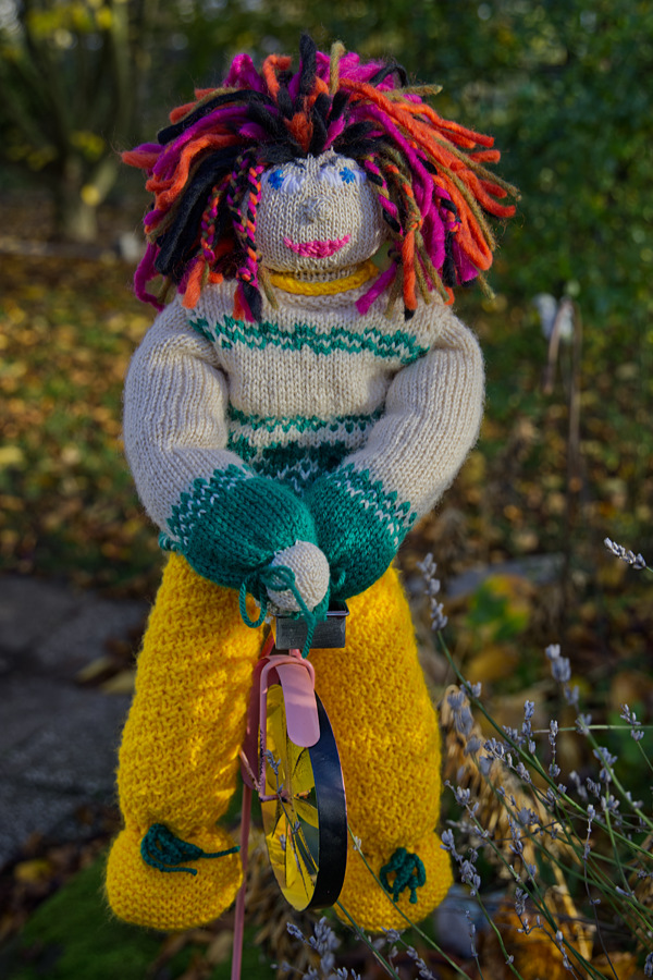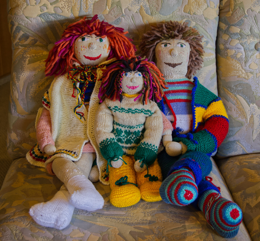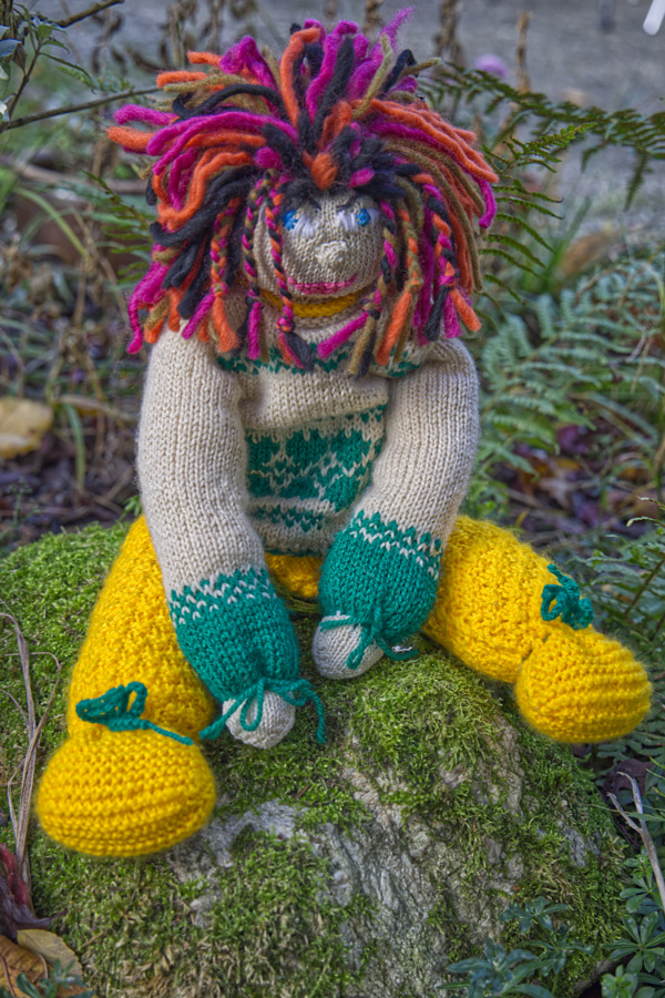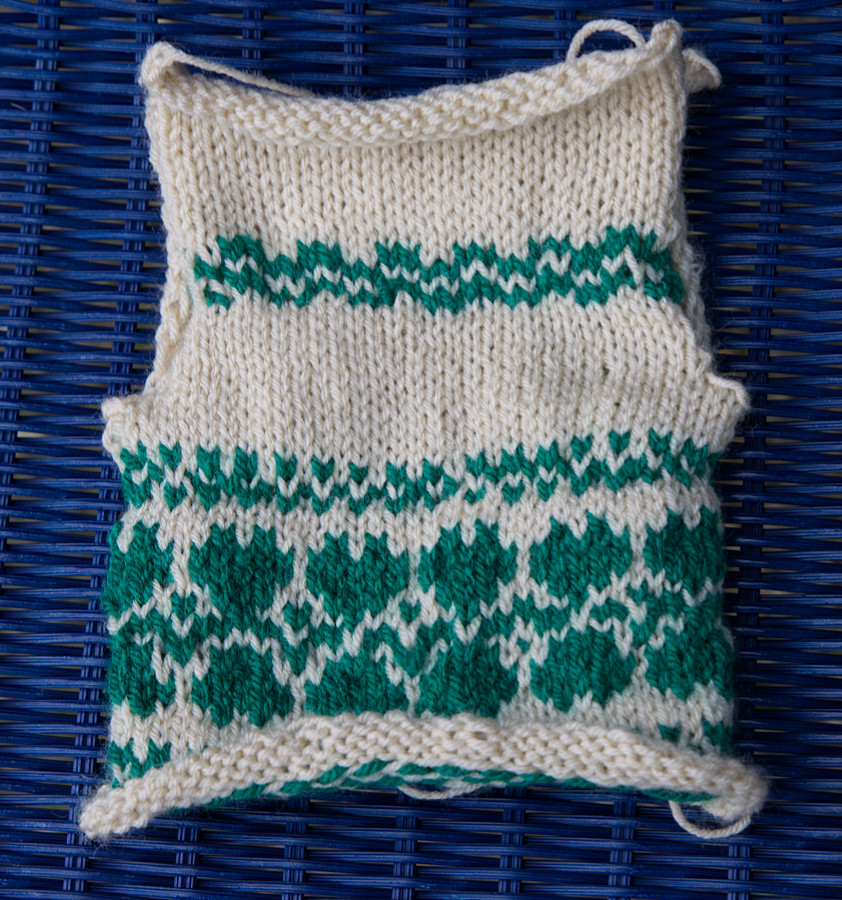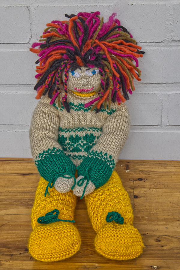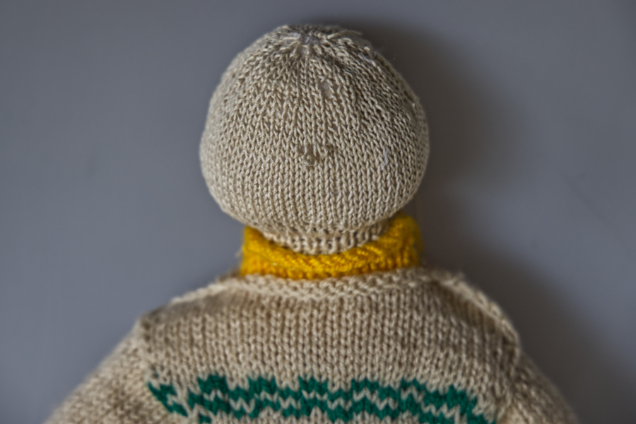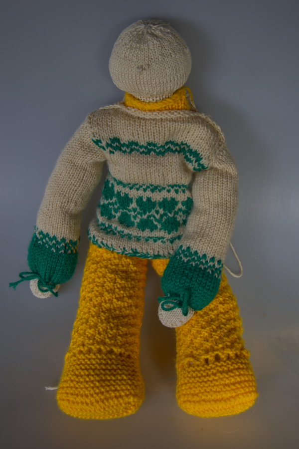 Die Wolle ist von Bravo, die Farben sind gelb, grün und beige. Ich brauchte keine Strickprobe, da ich ja auf Erfahrungswerte von den anderen Strickpuppen zurückgreifen konnte.