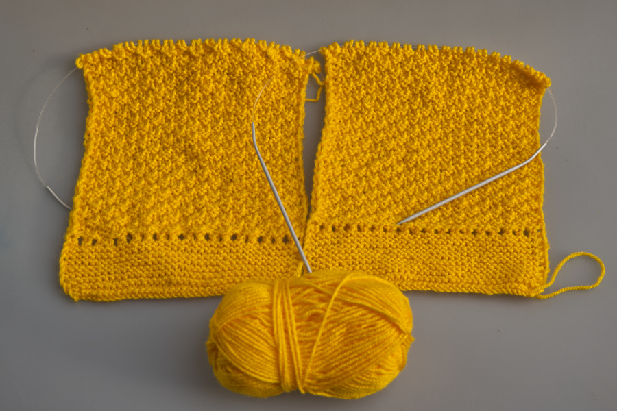 Ich habe 38 Maschen in gelb angeschlagen und 18 Reihen immer rechts gestrickt. Dann folgte eine Lochreihe, also 2 Maschen zusammenstricken 1 Umschlag etc. Die Rückreihe dann links stricken.