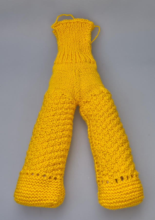 Die Maschen jeweils abketten, die Hose ist fast fertig. Nun die Füße und die Seiten der Beine zusammennähen und mit Stopfwatte füllen.
