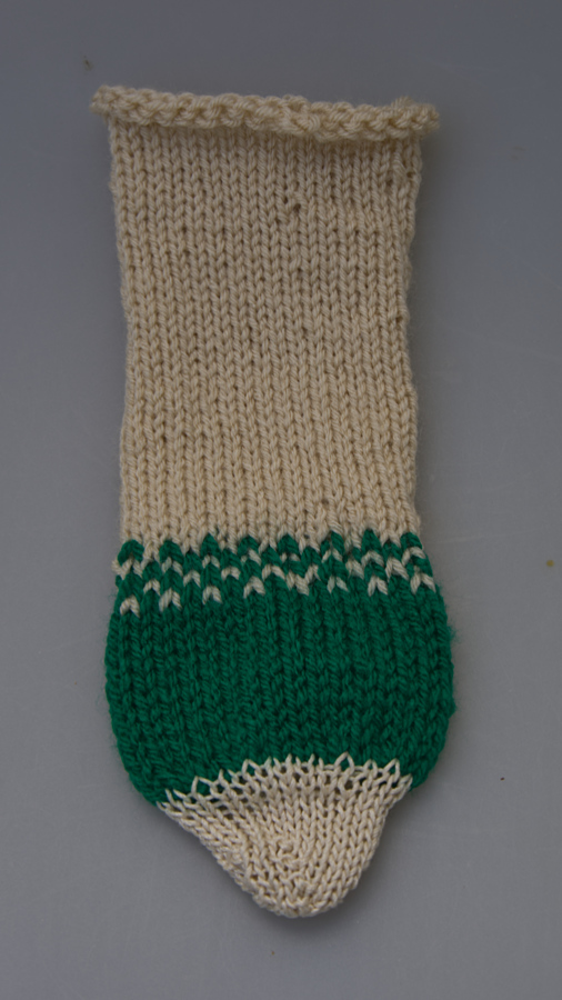 Ich habe 13 cm rechts in Runden gestrickt. Dann im Wechsel 1 Masche grün, 1 Masche beige, die nächste Runde 1 Masche beige und 1 Masche grün, die beiden nächsten Runden einmal im Wechsel grün und beige. Nun 5 cm weiter in grün stricken.
