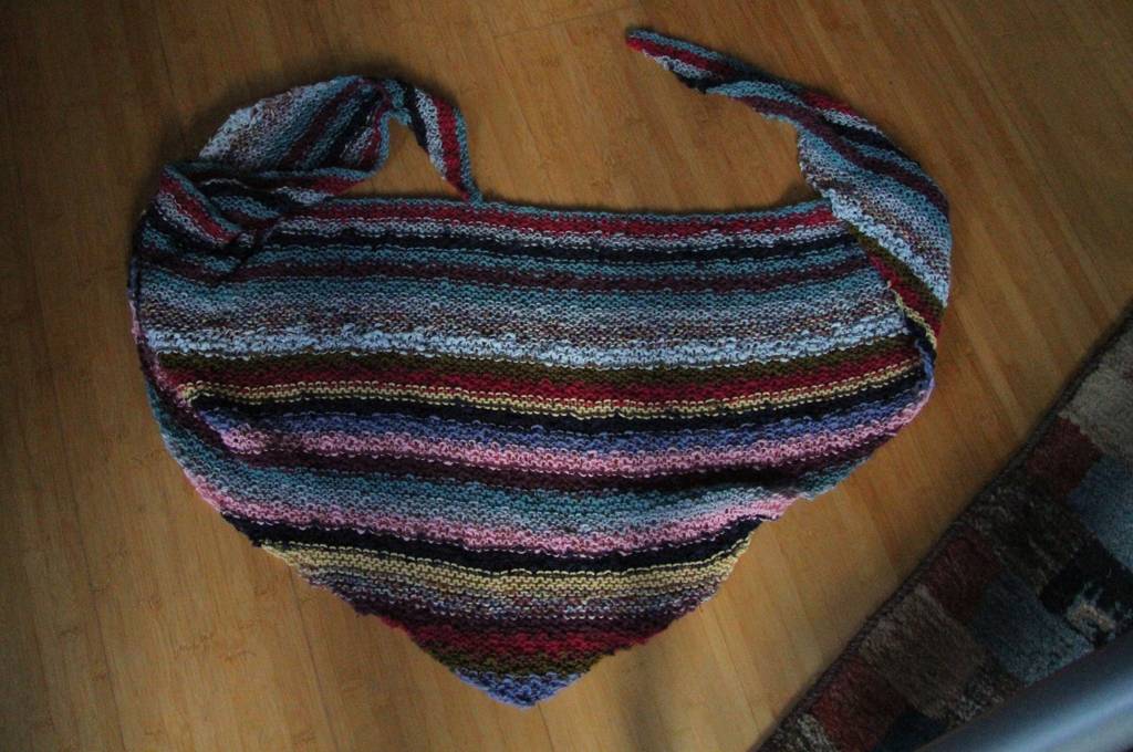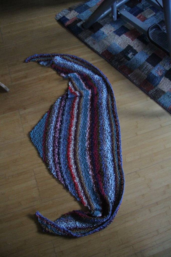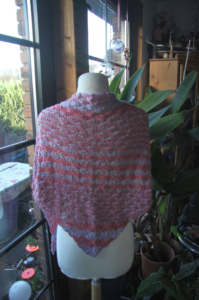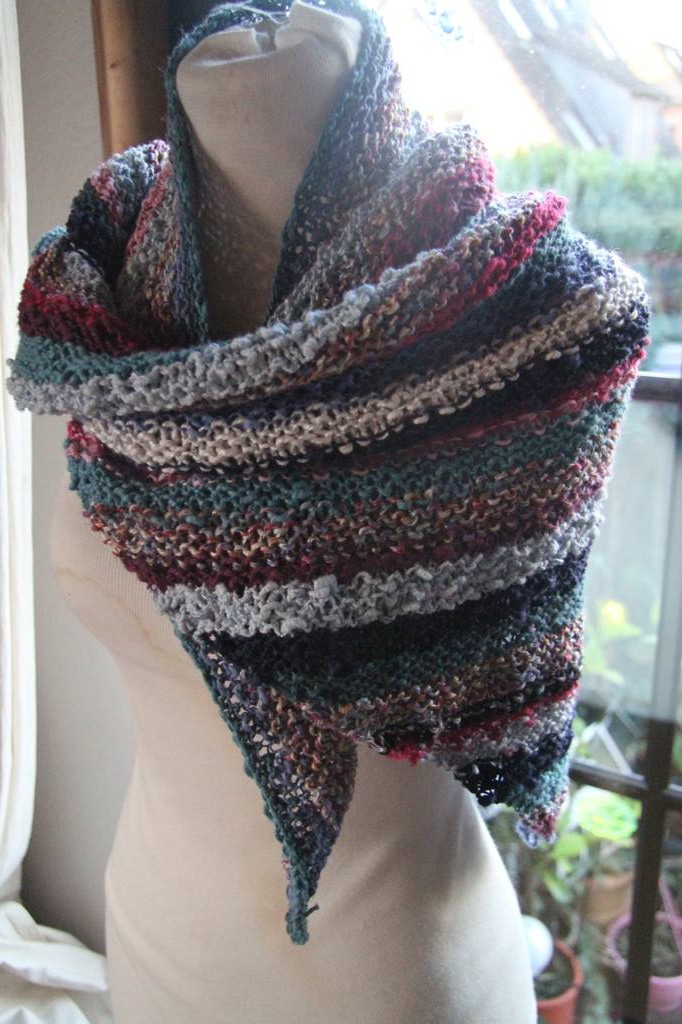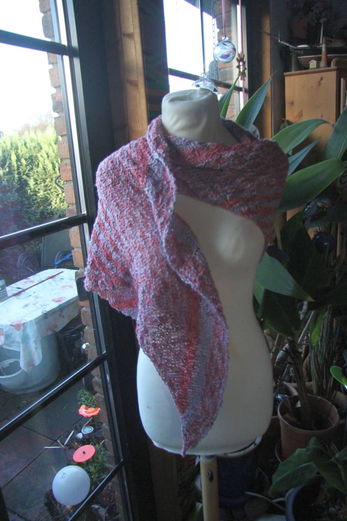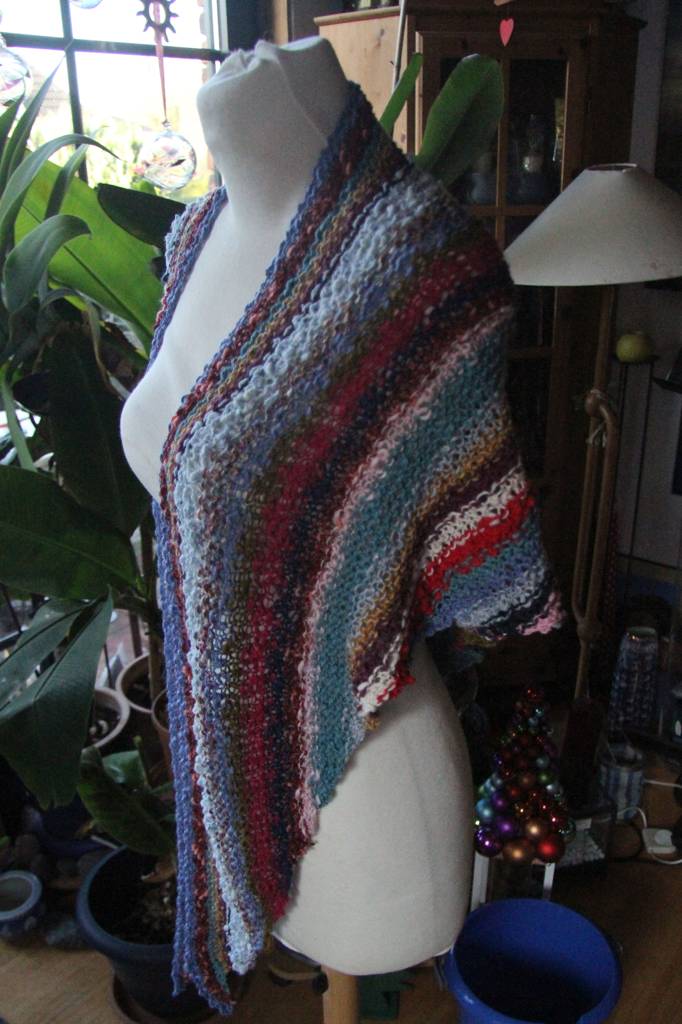 • Ich habe ja neulich meine Altwolle sortiert und das Ergebnis ist dieses Schultertuch aus Baumwollresten - keine glatte Baumwolle, sondern eine, wo überall kleine Knoten drin sind - mir fällt gerade der Name dafür nicht ein.... Es ist noch mehr davon über, da gibt es garantiert ein weiteres Tuch. Ganz einfach gestrickt - rechte Maschen und jede zweite Reihe, manchmal auch nur jede 4. Reihe je rechts und links eine Masche zugenommen