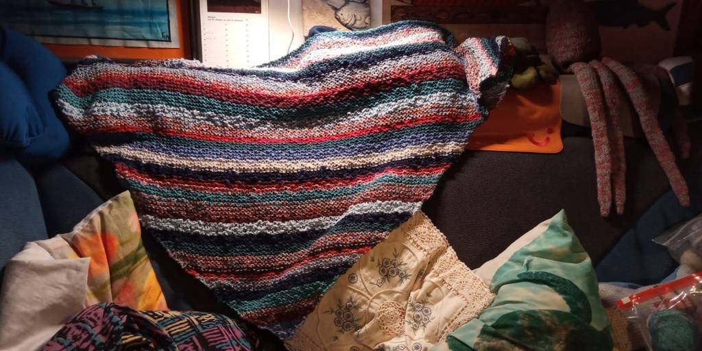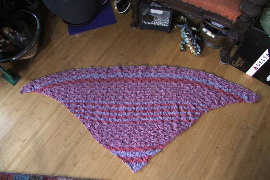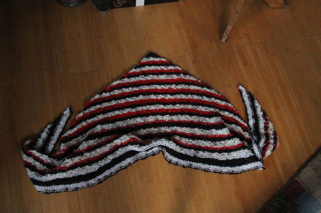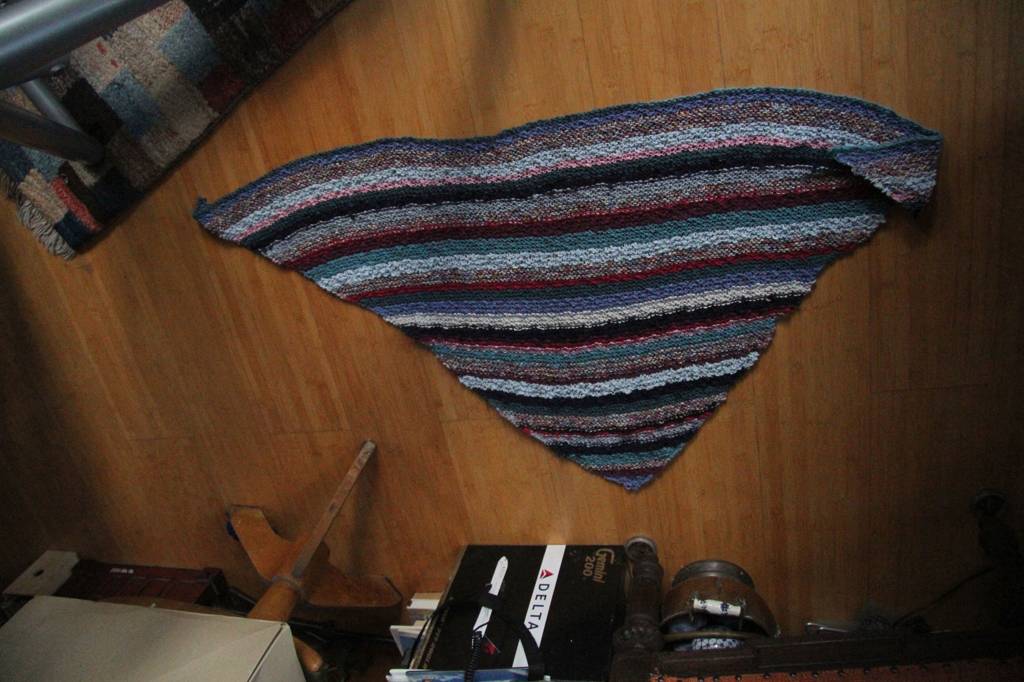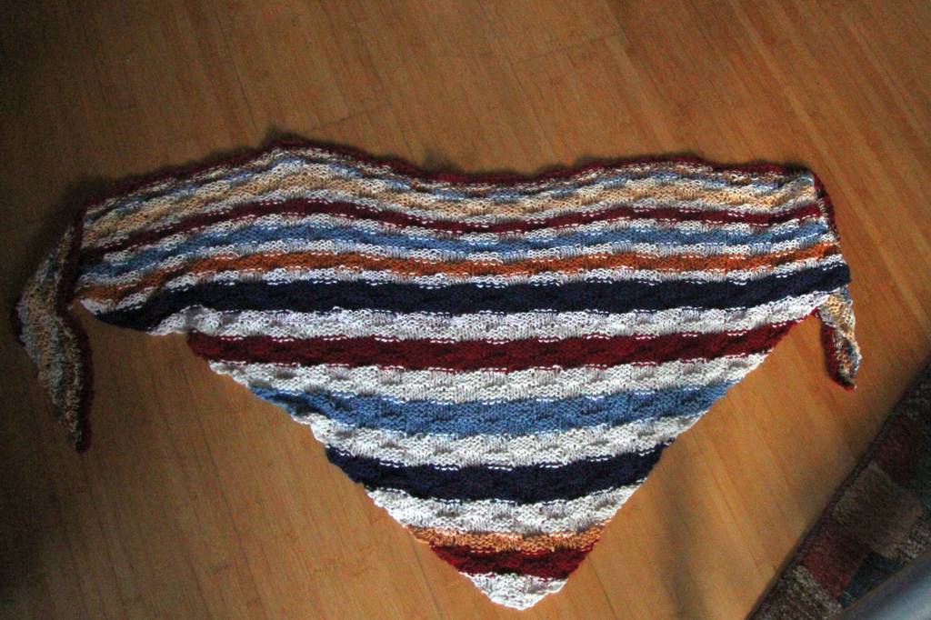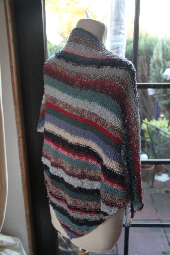 • Ich habe ja neulich meine Altwolle sortiert und das Ergebnis ist dieses Schultertuch aus Baumwollresten - keine glatte Baumwolle, sondern eine, wo überall kleine Knoten drin sind - mir fällt gerade der Name dafür nicht ein.... Es ist noch mehr davon über, da gibt es garantiert ein weiteres Tuch. Ganz einfach gestrickt - rechte Maschen und jede zweite Reihe, manchmal auch nur jede 4. Reihe je rechts und links eine Masche zugenommen