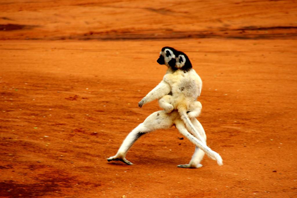 Das sind die tanzenden Sifakas, die bewegen sich mit Riesensprüngen vorwärts und hängen oft kopfunter in den Bäumen.